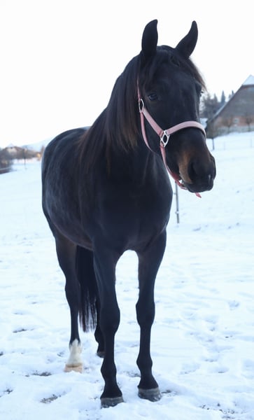 Magnifique et très sociable hongre suisse Warmblood. Né le 24 avril 2023, Darky CH attire tous les regards avec son pelage noir-brun. Surné Donnerhall en double, il descend du keur Westfalen Daddy’s Best, qui excelle en compétition de dressage et de saut d’obstacles, monté ou en selle, et possède un caractère exceptionnel. La mère de Darky CH, Diwa d’Anwil, est une fille de GB Don Calypso, avec de nombreuses victoires et classements en saut d’obstacles. Elle est prudente au saut, a une selle très souple, et est sûre en terrain varié comme en circulation. Darky CH a grandi dans un pré à poulains, connaît le programme de base des jeunes chevaux, est attentif et facile à manipuler, et n’a pas encore été monté. En pleine croissance, il vient directement de l’éleveur et sera un partenaire idéal pour un cavalier de loisir ambitieux ou un compétiteur. Prix sur demande. Plus d’informations : Josef Christen, 079 734 68 99.