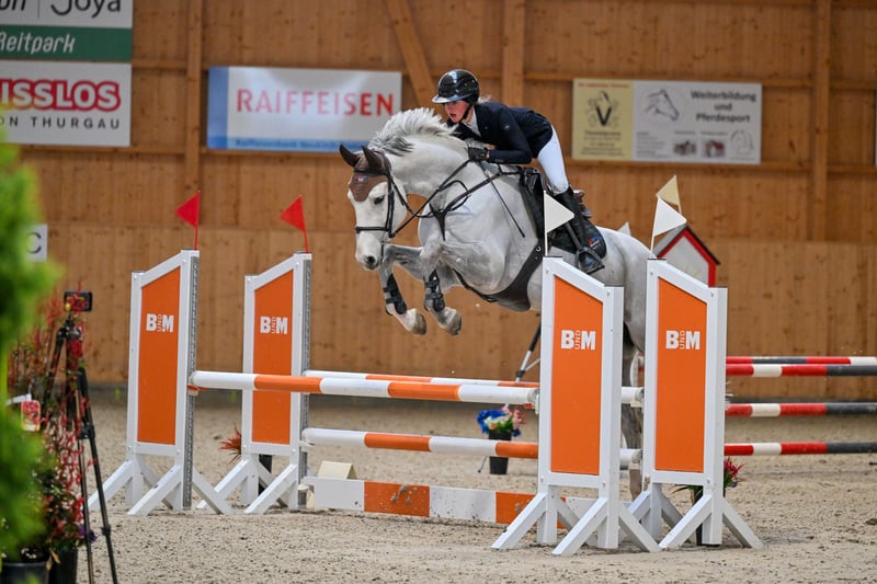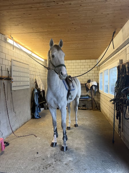 For sale: Young Swiss Warmblood gelding, born in 2021, in an elegant gray coat. The horse impresses with his promising jumping talent and his pleasant temperament. He has a solid basic training and already demonstrates initial technical jumping skills. The gelding is well-ridden, attentive, and approaches the jump willingly. Ideal for ambitious young riders seeking a reliable show jumping horse that can be further developed. Please feel free to contact me for more information or to arrange a viewing.