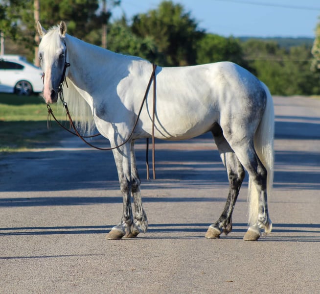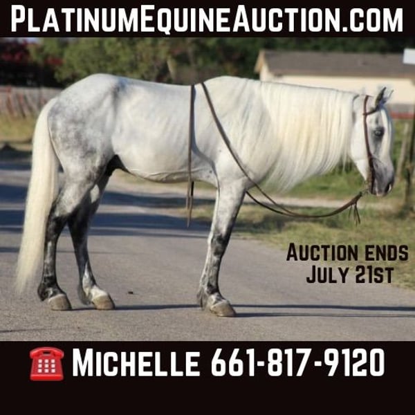 ONLINE AUCTION Place your bids at www.PlatinumEquineAuction.com Starting Bid $3500 Auction ends July 21st, 2024 Need a new saddle? Check out White Rock Saddles on our website or Facebook! Have you been searching for that life long trailblazer then “Iceman “ is the guy for you! He is as pretty as they come, long gorgeous thick mane, tail and forelock with two glass blue eyes! He is a 14 year old Rocky Mountain cross and standing 14.0hds tall. This guy can fly he has been clocked at 21MPH!! He is unique and will get you noticed wherever you go ! Iceman has been in multiple parades and was just rode in our Fourth of July parade with crowds of people, semi trucks and honking horns etc. He loves to hit the trails and will go wherever you point him up and down hills, he will cross logs, bridges and anything else you may come across down the trail . He has been trail rode all over the United States including many state parks . Iceman loves the water, he loves swimming in the rivers and cooling off after a long ride. Iceman is very personable and loves attention, he will stand all day long and go to sleep while your brushing, and washing him. He loads and unloads off the trailer, stands for the farrier, he gets along great in a herd or by himself. If you need help with transport don’t hesitate to ask we have a list of reputable haulers that can get him safely to your doorstep world wide. Located in Stephenville, TX. Contact M$ Performance Horses Michelle 661-817-9120. ONLINE AUCTION Place your bids at www.PlatinumEquineAuction.com Starting Bid $3500 Auction ends July 21st, 2024 Need a new saddle? Check out White Rock Saddles on our website or Facebook!