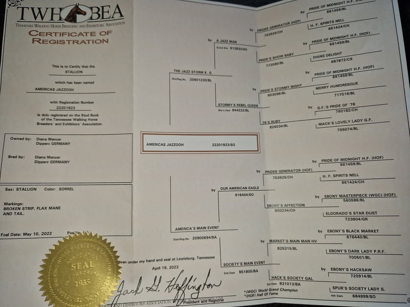 Americas Jazzooh, aka Snickers, ist ein sehr feinfühliger,verschmuster,bildschöner, intelligenter kleiner Kerl, der durch seine freundliche Art sehr einfach im handling ist. Fremdem gegenüber ist er zwar erstmal misstrauisch, gibt man ihm ein klein wenig Zeit, sich damit zu beschäftigen, gibt es aber kein Problem und er macht am Ende alles mit. Ein Blick in sein Pedigree lässt erahnen wieviel Gangpotential in ihm steckt. Er zeigt den Walk mit deutlichem Overstride und Canter frei auf der Koppel. Snickers ist im Herdenverband aufgewachsen und stand bis zur Kastration im vergangenen Jahr in einer Hengstherde. Danach lebte er 24/7 in unserer gemischten Herde im Offenstall. Als Herdenmitglied benimmt er sich vorbildlich. Sein Körperbau ist korrekt, mit hoher Aufrichtung, trockenem Fundament und harten Hufen. Als kleines Extrabonbon hat er noch eine wunderschöne lange blonde Mähne. Snickers ist seit Anfang November 25 in professioneller Ausbildung durch eine TWHBEA Trainerin in Norddeutschland. Der Preis steigt natürlich mit seinen Ausbildungsfortschritten. Aufgrund seiner Sensibilität und seines Alters ist er( noch) kein Anfänger- oder Kinderpferd. Das sollte sich von selbst verstehen. Snickers sucht sein für immer zu Hause, bei SEINEM Menschen, der ihn ,seinen Anlagen entsprechend weiter fördert und liebt. Man kann sie leider nicht alle behalten...