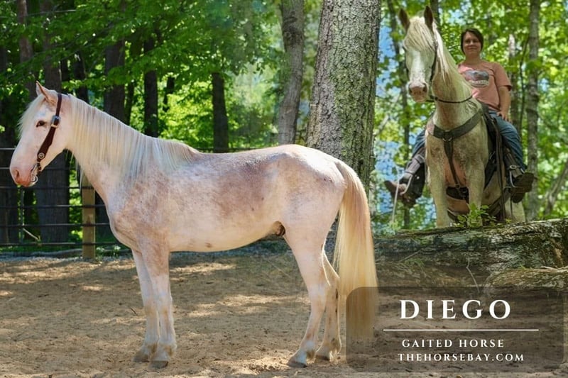 Diego is an awesome gelding. He’s smooth as silk, He’s absolutely gentle. He stands to mount he will also pick you up at the mounting block. Diego goes through creeks and over logs through brush etc. He’s traffic safe and has been exposed to all aspects of livestock as well as ATMs Diego has been down countless miles of trails and handles himself very well! Diego stands for baths as well as the farrier. He leads loads and ties without a fuss. Diego is good with tarps guns, and you can ask him to do just about whatever. He’s just a well-mannered family horse that’s fun to ride around!