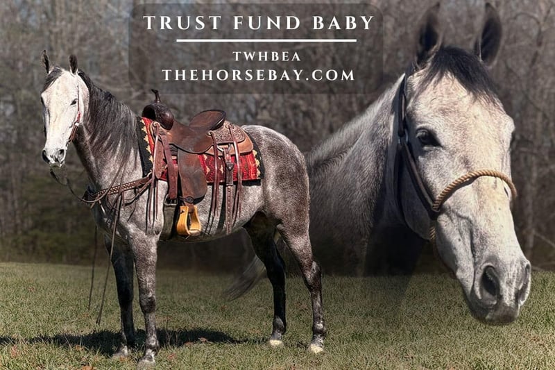 ••Trust Fund Baby•• A beautiful dapple grey registered 5-year-old Tennessee walking horse gelding, standing at 15.2hh. To not write a whole book on this gelding is impossible; he is simply the dream horse everyone is looking for. Trusty is safe, sound, and sure-footed. He has been ridden all over, on countless camping and overnight trips. Anything trusty encounters, he has full confidence in and does not lack it. No matter if you are out in the woods and encounter downed trees, wildlife, creeks, and rough terrain, or on the road around a bunch of traffic, Trusty does not hesitate. This gelding is exceptionally built; his stout build, along with his gorgeous dapple grey color, will have people constantly complementing you on him, and his wonderfully smooth four-beat gait will have you wishing you had 10 more just like him. Trusty has had countless miles on him, making him suitable for any level rider. Whether you are a beginner looking for confidence, or an experienced rider wanting a dependable, enjoyable mount. Trusty carries himself with a quiet confidence that is hard to find in a horse. There is no guesswork with this gelding; what you see is what you get every single time. Trusty is perfect by himself or in a big group; he does not care, and his demeanor never changes. He has been ridden is countless groups of 40 plus, and he’s been ridden countless times by himself. This gelding stands for everything: mounting, shoeing, bathing, tacking up, etc. Trusty is easy to load, catch, haul, and stall or pasture. Trusty has been exposed to so much that it makes him so confident. Don’t want to walk and want to lead him on your golf cart or ATV? That’s fine with trusty; he does just fine. Need to drag some trees or stuff off, but don’t want to do it yourself? With trusty, you won’t ever have to drag anything ever again. You want to show off to your friends that you can crack a bullwhip or shoot your gun? Trusty doesn’t mind. I could go on and on telling you so much about this gelding; he is easily one of the best horses I’ve thrown a leg over. Trusty will make someone so happy to finally find their dream horse. Don’t miss out on this opportunity to get such a wonderful gelding. Come try him out and let him show you the gentleman he is.