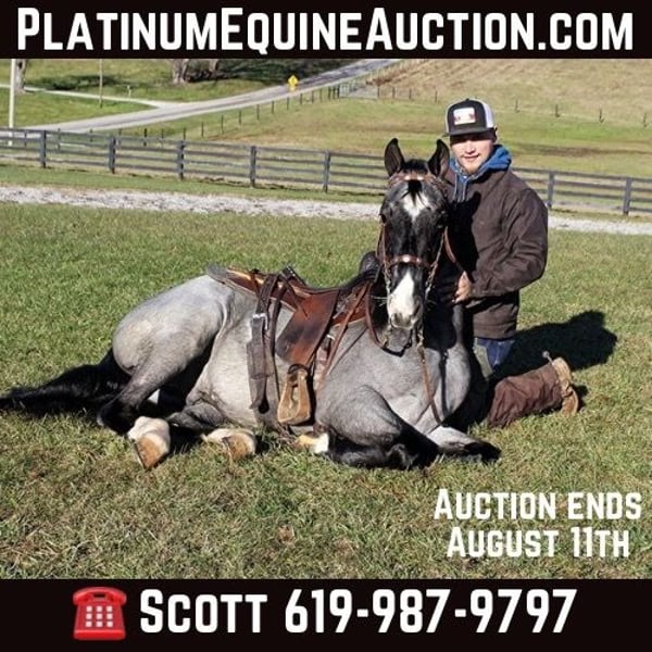 ONLINE AUCTION Place your bids at www.PlatinumEquineAuction.com Starting Bid $3500 Auction ends August 11th, 2024 Need a new saddle? Check out White Rock Saddles on our website or Facebook! I see Smoke but don’t worry “you’re not on fire Ricky Bobby”… SFF Pusher’s Blue Smoke (Blue) is standing around 15.1-15.2h, 2017 model registered TWH and is a True Blue Roan Gelding!!! He is a registered Tennessee Walking Horse and has a good pedigree. I bought Blue back in the spring and have trail rode him all summer, fall and winter. Blue has been trail ridden and camping in Tennessee, Ohio and throughout Kentucky. Blue is easy to catch, clip, bath, tack-up, load, and handle. Blue is a very well broke horse for his age, he has never tried to buck or bolt and he makes few mistakes. Blue has a very smooth and natural 4-beat gait all the way up to 12mph with a nice lope. He moves out easily and will also walk quietly on a loose rein. He has been ridden around farm equipment, ATV’s, over large noisy tarps and has also had guns shot off of his back. No matter where he goes or what he does, Blue is not spooky acting. On the trails he is always great! Blue has been exposed to all kinds of wildlife such as deer or turkey or other animals like cows or dogs and will go anywhere that he is asked too. He has been rode many miles in the mountains of Eastern Kentucky and Tennessee and encountered every obstacle possible on the trail. He will go up or down even the steepest slopes, across deep creeks, over downed trees, and over all types of rough terrain while still being sure footed. He has been rode in traffic and is safe around cars and trucks. He has a great attitude and an easy going personality. He is a horse that you can take home and finish him any way that you want him to be! You can Smoke all you want too here without any risks!!! I bought Blue 4 years ago and we have transitioned to quarter horses, call Scott Aurich 619-987-9797 for more info. Located in Bonita, CA. ONLINE AUCTION Place your bids at www.PlatinumEquineAuction.com Starting Bid $3500 Auction ends August 11th, 2024 Need a new saddle? Check out White Rock Saddles on our website or Facebook!