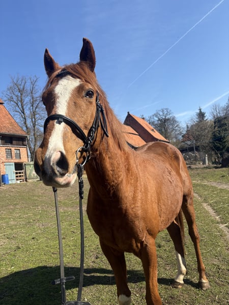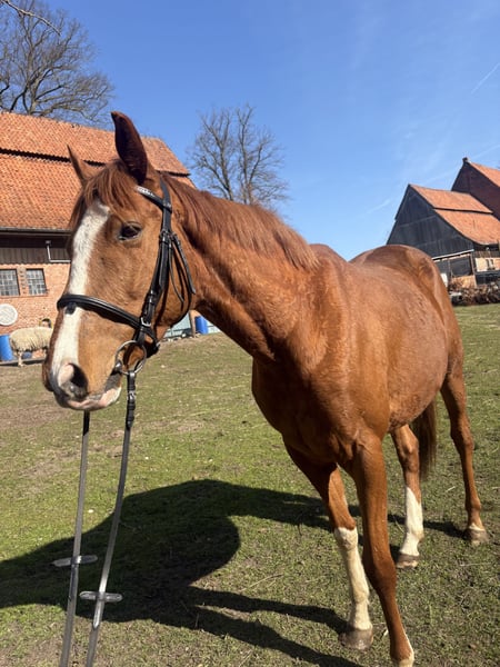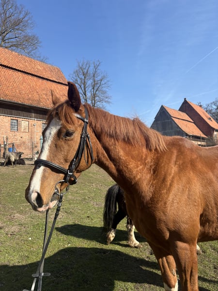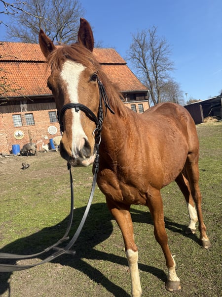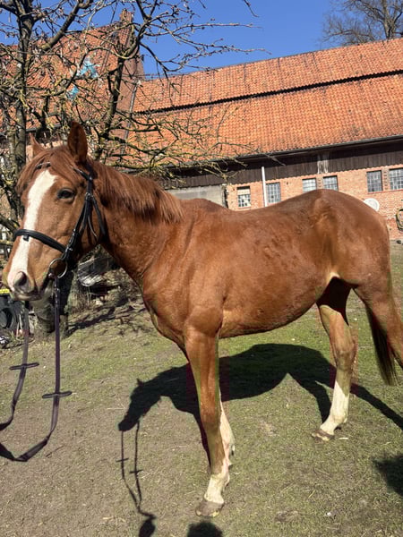 Schweren Herzen gebe ich meine 4 1/2 jährigen Vollblut Wallach, aufgrund meines Unzuges und damit fehlender Zeitlicher Kapazität ab. Valou ist ein englisches Vollblut mit einem Stockmaß von 160cm. Er ist angetritten, lässt den Reiter gut zu und zeigt sich stets kooperativ. Altersbedingt hat er natürlich noch viel Lern- und Entwicklungspotenzial. Valou ist ein sehr sensibler und feinfühliger Wallach und etwas für die erfahrene Reiterhand aber mit etwas Geduld und Einfühlungsvermögen, kann er ein super Partner in allen Lagen sein. Er kennt sowohl den Schmied, Tierarzt als auch den Anhänger und lässt diese gut zu. Auch Arbeit auf dem Platz oder im Gelände sind ihm bekannt. Momentan steht er in einer bunt gemischten Herde aus Ponys und weiteren Großpferden, dort integriert er sich gut und zeigt ein tolles Sozialverhalten - Er kennt sowohl Offenstall, als auch Boxenhaltung und kommt mit beidem gut klar. Zubehör wie Sattel/Trense und diverse Kleinteile können auf Bedarf mitgegeben werden. Es sind keiner Verletzungen oder Vorerkrankungen bekannt. Mir ist wichtig das er seinen Mensch findet, der sein Potential erkennt - daher Platz vor Preis. Dies ist kein Notverkauf.