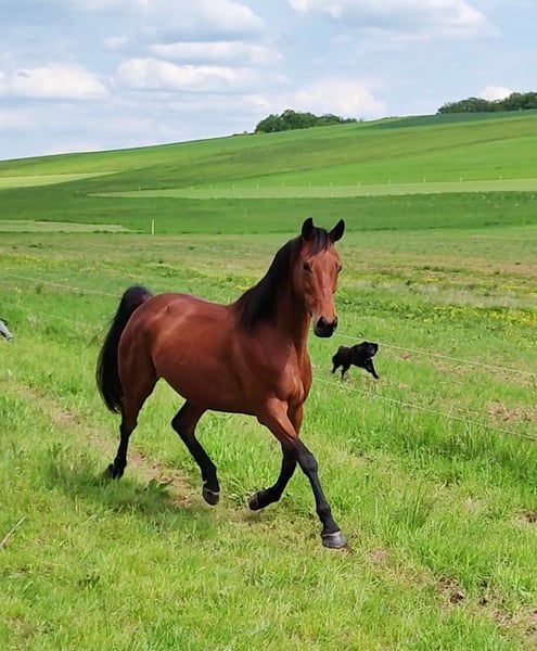 Foxred - Vielseitiges Reitpferd mit großer Perspektive! ! Es gilt PLATZ VOR PREIS, für diejenigen die ein schönes Zuhause mit ganzjähriger Weide / Robusthaltung bieten können ! 6-jähriger, 165cm großer, brauner Vollblut Wallach mit moderner Abstammung V: ANJAAL, M: AMARY. Fox beeindruckt auf Anhieb. Im Umgang sehr kopfklar und unkompliziert, unerschrocken und dem Menschen zugewandt, begeistert er unter dem Sattel durch Zuverlässigkeit, angenehme Bewegungsfreude und genügend Sensibilität für das große Viereck oder die Arbeit mit Kindern/Jugendlichen. Er ist Arbeitswillig und beeindruckt immer wieder mit seinem menschenbezogenen Wesen. Er lässt sich toll alleine Arbeiten, braucht keine Sicherheit durch andere Pferde und kommt in einer neuen Umgebung sehr schnell an. Ideal für Auswärtstraining, Turniere oder Wanderritte. Er begeistert mit seiner inneren Ruhe und einem einwandfreien Charakter. Seine drei sehr guten Grundgangarten lassen sich bequem sitzen und bieten viel Potential für mehr Vorhandaktion und Raumgriff. Seine Anlehnung ist fein und macht dem Reiter Freude beim Abrufen der gelernten Lektionen. Fox liebt auch das Gelände und ist hier ein zuverlässiger Partner, ob in Begleitung oder bei einem Ausritt alleine! Er ist auch hier sehr entspannt und unkompliziert. **** www.handmade-horses.de **** ✔️ Geritten und Geländesicher ✔️ Anfängergeeignet ✔️ Kinder- & Jugendpferd ✔️ Gesund ✔️ Geimpft und Entwurmt ✔️ Volle Papiere und Equidenpass ✔️ Schmiede- und Verladefromm Eine Ankaufsuntersuchung kann gerne im gewünschten Umfang in Auftrag gegeben werden. Kennenlernen & Probereiten (45 Euro), Transport ins neue Zuhause,... nach vorheriger Absprache und gegen Übernahme der Kosten gerne möglich! Fox ist bestens sozialisiert, schmiede- und verladefromm, barhuf und wird nur in eine artgerechte Haltung mit ganzjähriger, zugänglicher Weide abgeben. Er ist Aufsetzkopper und benötigt u.a. deshalb große Weideflächen (ab 5000qm auch im Winter) um gesund und glücklich zu sein. Er liebt Robusthaltung und möchte keine Box oder zu kleinen Offenstall. Bitte bei mir über Whats app ( 01778787640 ) melden.