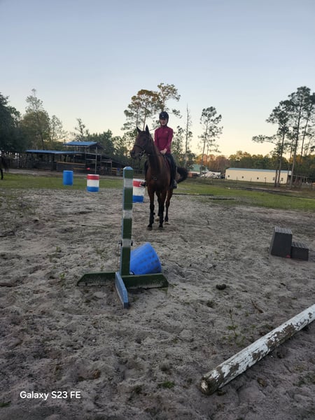 She is so sweet, stands for farrier. Loads up each ride She gets better. I gave her some time off after the track, and then we started lunging and building a lot of muscle strength and undersaddle. We walk, trot and canter in circles and also here, and there over some jumps this horse, it's going to be an amazing Hunter eventer even show jumping and dressage type of horse. Our first jump has been a log if you're looking for a project that wants to try a hardest for you. This is her message me if interested. Thank you.