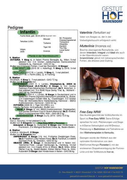 Infantin ist eine junge Vollblutstute, die nicht in den Rennsport gegangen ist, sondern reitsportlich ausgebildet wurde (Aktuell A-Niveau). Sie ist herdengeprüft und im Umgang mit Menschen aufmerksam und händelbar. 2024 ist sie in die Zucht gegangen und hat 2025 ein sehr schönes erstes Fohlen (Stutfohlen von Duplexx). Daraufhin wurde sie 2025 erneut mit Duplexx angepaart. Da in der I-Linie mehrere Stuten vorhanden sind und nun ein Stutfohlen von Infantin den Zuchtbestand des Gestüt Hof Warendorf bereichert, steht Infantin zum Verkauf.