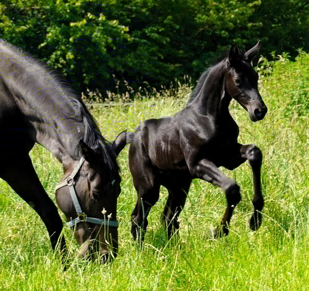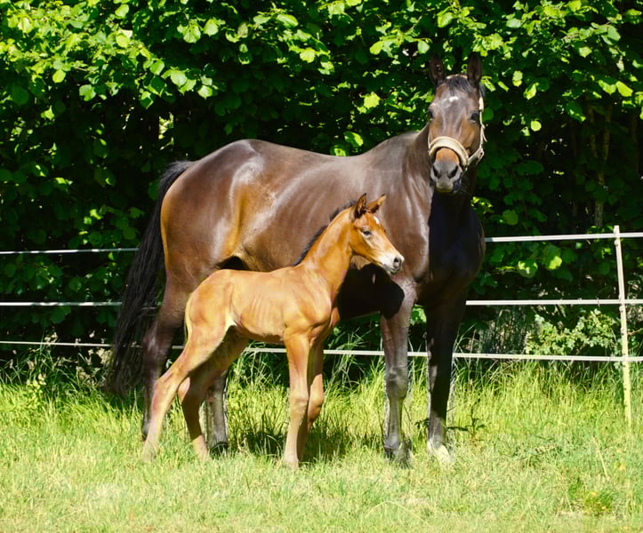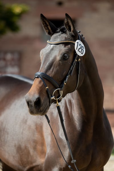 Mit der Prämienstute Perserkrone wird hier eine äußerst qualitätsvolle Stute aus dem wertvollen Stamm der Pelargonie (Hauptgestüt Trakehnen) angeboten. Sie war Reservesiegerin ihrer Eintragung und legte die SLP mit der guten Note 7,84 ab. Krönchen überzeugt durch drei überragende Grundgangarten, die stets geprägt sind von energischem Abfußen mit viel lockerem Grundschwung, Kadenz und Gleichmaß. Aufgrund ihrer großen Qualität und Rittigkeit wäre auch eine reiterliche Verwendung gut denkbar; Ausbildungsstand ist die Anforderung der SLP. Bisher zur Zucht eingesetzt, brachte Krönchen in vier Zuchtjahren vier absolut typ- und bewegungsstarke Fohlen zur Welt, die sich ausnahmslos durch eine auffallend freundliche und ausgeglichene Art auszeichnen. Tragend werden, Trächtigkeit und Geburt verliefen bisher völlig komplikationslos. Der Umgang mit den Fohlen ist sehr mütterlich und von viel Übersicht geprägt. Auch das Verhalten in der Herde ist vorbildlich. Aktuell ist Krönchen erneut tragend von Kenneth; Abfohltermin ist Ende Mai 2026. Das Pedigree lässt keine Wünsche offen: Silvermoon, der auch als Vater u.a. der international erfolgreichen Stute Blue Horse Matiné seine Vererbungskraft eindrucksvoll unter Beweis gestellt hat, kann selbst zahlreiche Erfolge in Dressur Kl. S vorweisen und verbindet sich hier mit den auf der internationalen Grand Prix-Bühne erfolgreichen Hengsten Monteverdi und Friedensfürst. Die mütterliche Genealogie ist mit Perserfürstin, Perkallen und Pilkallen geprägt von hoch prämierten Spitzenstuten besonderer Machart aus dem Stamm der internationalen GP-Stars Partout und des olympischen Bronzemedaillengewinners Peron. Krönchen wird nur aufgrund platzbedingter Verkleinerung der Zucht in gute Hände abgegeben.
