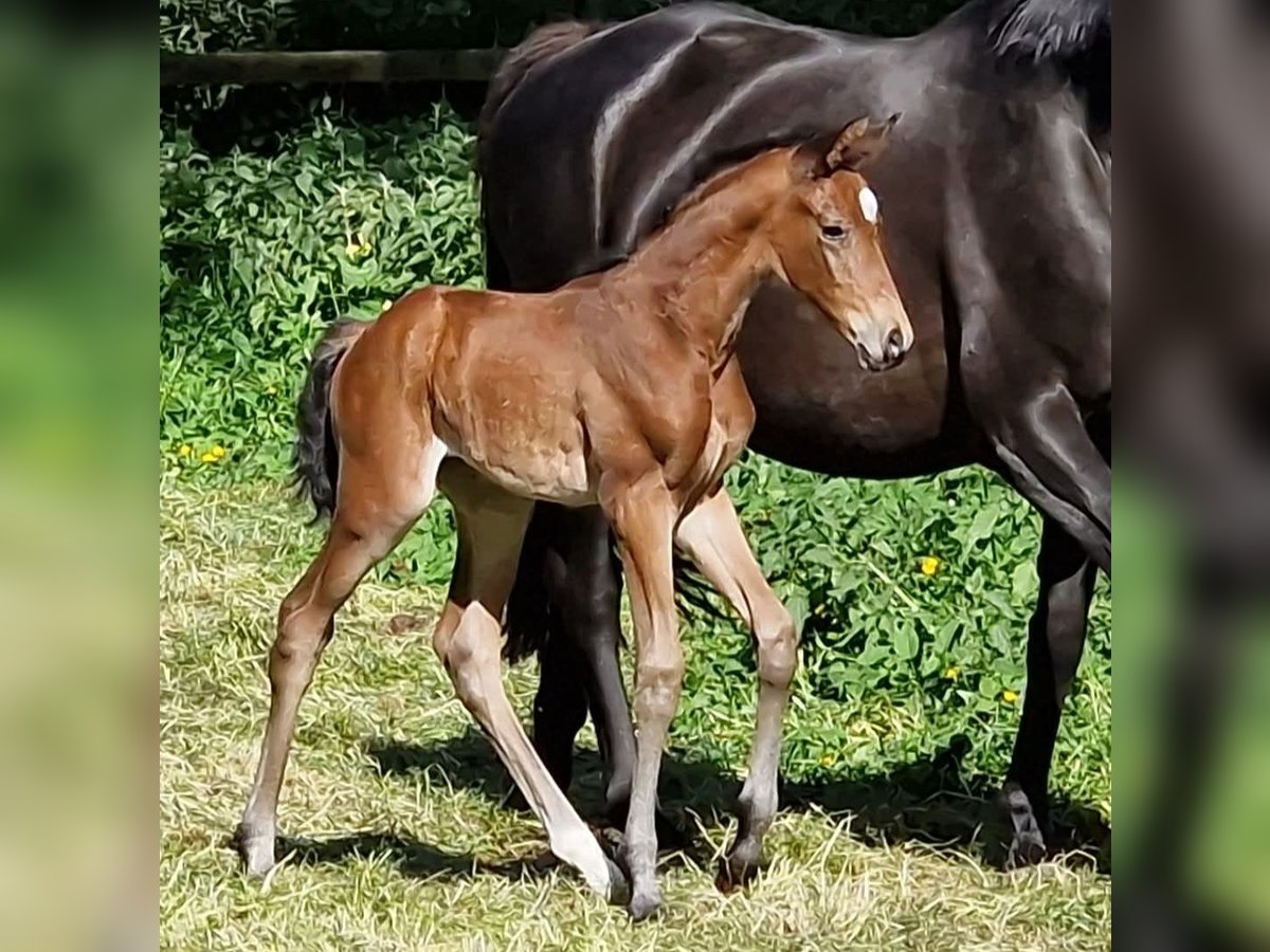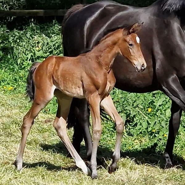 Herzliebe ist bei uns auf dem Gestüt Majenfelderhof im Mai 2025 geboren und verzückte uns von Geburt an. Ihr Vater der Prämienhengst Noupier x stammt ab von dem bewährten Vielseitigkeitsvererber Duke of hearts xx vom Söderhof, Noupier´s Muttervater ist kein geringerer als der für Dänemark startende Welt- und Olympiateilnehmer Troupier x unter Nils Hagensen. Aber auch Herzliebes Mutter Herzsonne (Gewinnerin des Freispringcup´s SH) kann auf eine erfolgreiche Vielseitigkeitslaufbahn zurückblicken , wobei ihr Vater Axis TSF ja ausschliesslich in der Dressur bis zur Klasse S erfolgreich unter Terhi Stegars für Finnland an den Start ging. Ein internationales Pedigree in diesem typvollen Stutfohlen lässt alle Wege offen. Gern kann die bewegungsstarke und menschenbezogene Herzliebe in unserem Herdenverband unter grüßzügigen Aufzuchtbedingungen in erfahrenen Händen großgezogen und auch ausgebildet werden.