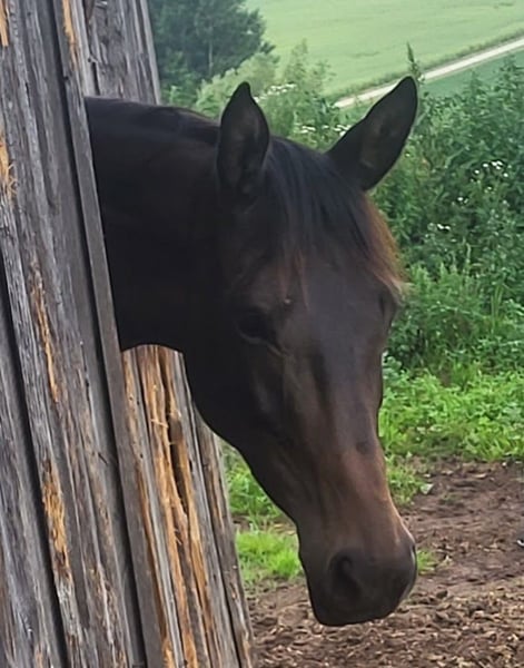 Super sweet, beautiful, and well-mannered Trakehner mare directly from the breeder! Kalani was once pregnant but had a miscarriage. Therefore, she is not yet fully trained for her age. I would say she is well started under saddle. No problem in the terrain; she would never rear, bolt, or similar, as long as she is treated fairly. Currently, we are working on her position and bend, which is improving steadily. She is very suitable for beginners in terms of character, but depending on the goals, further training by an experienced rider is necessary. Unfortunately, the mare does crib a bit, which is why she is priced below her value, and please only to open stable or pasture housing. Closely related to the dressage world-class mare Dalera. More pictures will follow soon.
