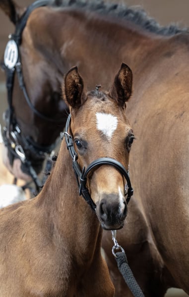 Este hermoso potro de semental nacido el 12 de mayo ha sido declarado digno de premio en la inspección y ha sido invitado al Campeonato de Potros del Oeste en Alemania, con las siguientes puntuaciones: 8 – 7.5 – 7.5 / 8 – 7.5 – 8 / 7.5, sumando un total de 54 puntos. La madre, H'indy (hija de Hirtentanz), es una yegua de élite y ha competido en eventos de M en salto y en doma PSG. (Ver artículo reciente en Facebook de Trakehner Rheinland). El padre es el reconocido semental de élite Millennium. Ambos abuelos también son de élite, y cuatro de los ocho antepasados anteriores también lo son. Como se mencionó en la inspección: “una descendencia de élite muy rara en este hermoso potro, con movimiento adicional. La combinación de todos estos genes ha dado lugar a un potro con gran carácter deportivo. Un potro llamativo con buenas conexiones, que se mueve con gusto y facilidad. Tiene un paso amplio y una bonita galopada con una expresión orgullosa y una estructura correcta.” Los sementales Millennium, Easy Game y Gribaldi no necesitan presentación en cuanto a sus logros deportivos, pero también en la línea materna hay mucho deporte, con varios caballos en la subtop además de la madre: (ver https://www.horsetelex.nl/horses/pedigree/2687995/havanarivo). El potro está bien criado y posee un carácter sobrio, inteligente y cooperativo. Ha sido desparasitizado regularmente y revisado por el herrador, quien no ha tenido que realizar ningún trabajo debido a la estructura correcta y la dureza de sus cascos. Tiene un trote adicional, muy tacto y, en el futuro, tendrá un pelaje oscuro, característico de los descendientes de Millennium. Después de la destete, el potro puede permanecer en la ubicación de cría si así se desea.