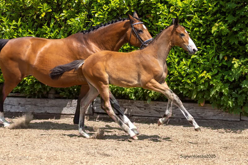 Sportiness at the highest level with international aspirations cannot be documented more emphatically than through this son of the world champion Grafenstolz TSF and grandson of the FEI Grand Prix winner Polarion TSF and the multiple course winner Hirtentanz. His son, born in March of this year, is thus a brother to Olympians and winners in the most challenging eventing championships in the world, such as Lexington, Burghley, Pau, or Badminton. Accordingly, this young talent from the best lineage presents himself as wiry, athletically impressive, and energetically focused on the tasks at hand. The mother has completed one of the best performance tests ever, naturally with dream scores for her jumping. She is connected to one of the few daughters of the elite stallion Parforce, who has personally proven his athletic performance in the course as well as that of his offspring. Additionally, with the third dam Holey Pasadena, we have a heroine in the S-level courses. She represents one of the best performance lines in the population; one of its most famous ambassadors is the great Habicht, who stands out as a representative focus.