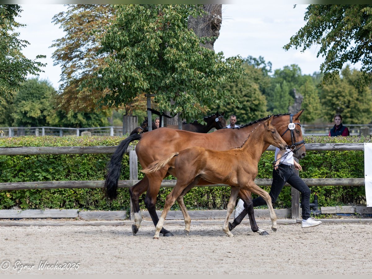 Cavallo molto simpatico, figlio del successo nel concorso completo del celebre stallone Painter’s Maxim, noto per la sua affidabilità come sire di progenie tipica, intelligente e altrettanto versatile. Questo si applica sicuramente anche a questo puledro dal carattere forte, che si presenta ancora un po’ timido al suo primo esordio pubblico in occasione del Campionato dei Puledri Trakehner, sul grande parterre del principale allevamento di Graditz. Nato relativamente tardi, il 21 maggio 2025, questo discendente della linea di sangue del campione di Coppa delle Nazioni Waitaki si mostra in una postura laterale armoniosa, con un corpo ben proporzionato. Grazie ai due influenti stalloni di sangue, Imperio e Michelangelo, entrambi affermati nel dressage fino alle più alte classi, questa giovane promessa ha una tendenza naturale a orientarsi verso la disciplina del concorso completo, offrendo buone prospettive di successo sportivo future.