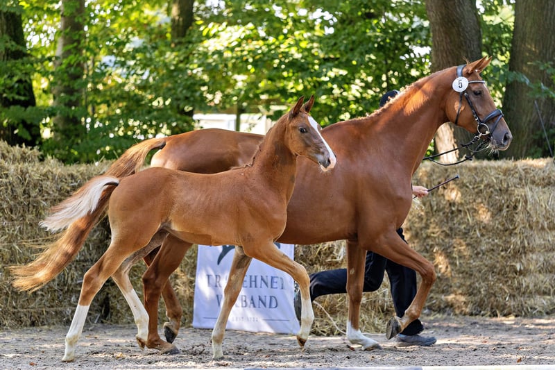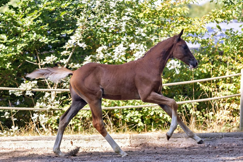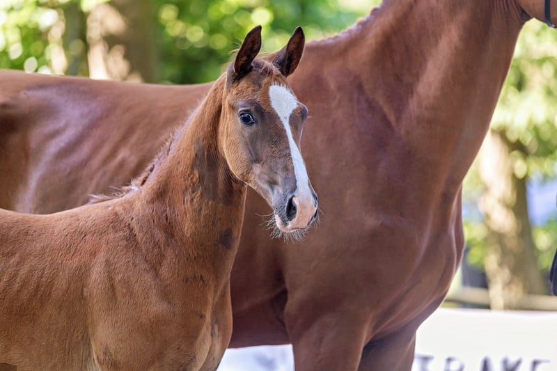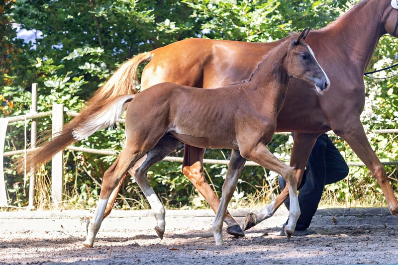 To źrebię ogierka od razu przyciąga uwagę! Silne w typie i ruchu, młody koń zdobył pierwsze miejsce w klasie skoków i wszechstronności podczas mocno obsadzonego czempionatu źrebiąt na Zachodzie. Prezentuje się jako typowy potomek swojego ojca „Alle Farben”, który w tym roku z wieloma jakościowo wyróżniającymi się źrebakami zyskał dużą uwagę w hodowli. Również znacząca matka „Kiss my Heart” wyróżniła się jako klacz zwycięska w rejonie hodowlanym Hesji w 2024 roku, a jej równie przekonujące debiuty hodowlane w młodym wieku zrobiły imponujące wrażenie. Córka krwiotwórczego ogiera z Warendorfu Touch my Heart jest ponadto jedną z ostatnich przedstawicielek tradycyjnej rodziny wydajnościowej z Bałtyku i dlatego w połączeniu z sportowymi genami ojca (Tecumseh, Waitaki, Inster Graditz i Ralf) stanowi pożądany skarb genetyczny o wysokiej ekskluzywności. W kolorowym wyglądzie wyraźnie odzwierciedla wpływ ojca, a także jest rytmiczna i luźna w ruchu, co czyni tego kandydata do przyszłych zadań sportowych i hodowlanych wyjątkowo rekomendowanym.
