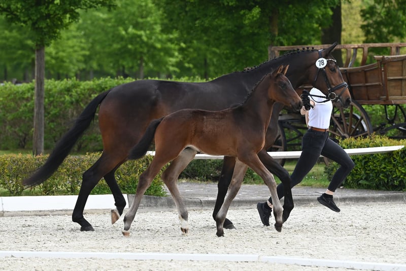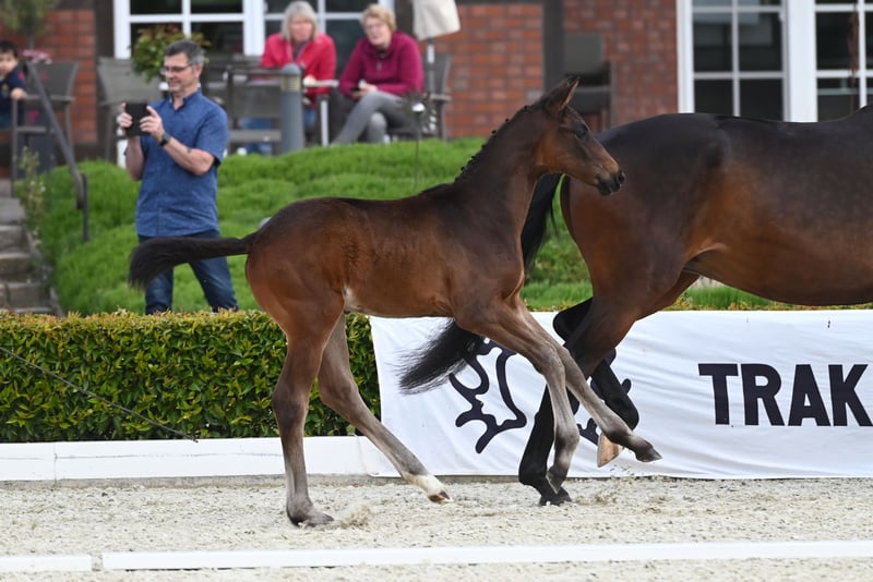 Proud son of E.H. Schwarzgold, who steps onto the sales floor here. Large in body and in transmission with a well working hind leg, that could be the short description. With good overall development, he impresses throughout with a swinging movement with rhythm and suppleness and a correct foundation. His sire Schwarzgold, himself successful in advanced (S) level dressage under Sascha Böhnke, is certainly one of the main Trakehner sires of the last decade. This is followed in the pedigree by the premium stallion Honoré Du Soir, as well as the valuable E.H. Kentucky, who has produced a not inconsiderable number of sport horses. The best prerequisites for later competition.