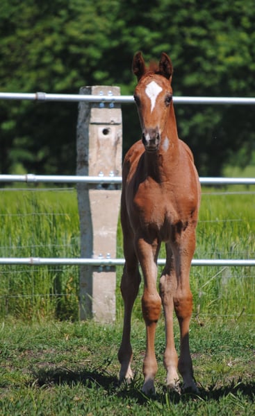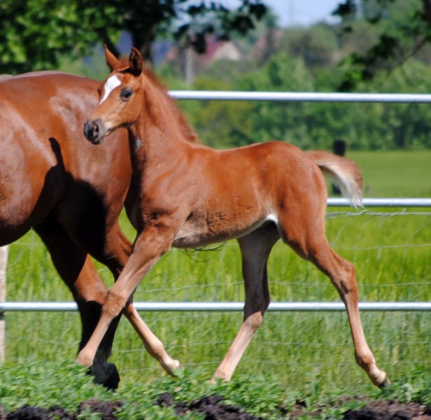The colt, born on April 5, 2024, is a rarity due to his absolute outcross pedigree and his attractive dark chestnut color alone. He is a son of the Anglo-Arabian premium stallion Noupier x by Duke of Hearts xx and a daughter of the Olympian and World Championship participant in military sport Troupier x. Our "Le Noble TN" is in turn a son of the Pr.St. La Vita TN by Cavallieri xx - Vespucci (Ramzes x line), the full sister of our Pr.H. Le Chevalier TN, the sire was the winner of the performance test and also the winner of his stallion performance test for eventing horses in Marbach. This pedigree, his conformation, correctness and quality of movement led to the highest possible rating at the foal registration, the 3-star premium and the recommendation of the breeding management to raise him as a stallion.