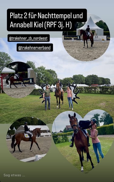 Night Temple by Tempelhof x Interconti, out of the distinguished mare St.Pr. and Pr. St. Nachtfürstin (T17C1a Nakita - Söchtig-Elmarshausen), presents himself as a powerful, completely clear-headed, well-mannered, and sportily ambitious competition partner with all the potential. His dam is the sister to the highly sought-after auction star Pr. St. Namika and represents a maternal dynasty that embodies both top-level hippological breeding and innovative breeding philosophy. The unforgettable granddam was already regarded as an breeding institution beyond the borders of her home stud Elmarshausen and produced, among other achievements, the licensed stallion Nachtruf and no less than seven daughters, some with double premiums, including the successful M-level dressage horse Nuschka (ex Nachtmusik). Night Temple is the first licensed son of his sire, Tempelhof. Night Temple himself is licensed, has already completed the performance test, and has also proven himself successfully in competition. In three show starts, he always placed among the top three horses. At three years old, he earned a silver medal in the young horse championship's dressage test and a bronze in the final. At four, he achieved first place in his debut jumping competition. Night Temple is always fully focused and attentive to his rider. In the foreign rider test, he received top marks with a score of 8.5. He is easily handled by ladies and demonstrates absolute reliability and good manners in handling. We see Night Temple both in high-level sport and in breeding. An ultrasound examination with crystal-clear X-ray images is available. Night Temple has been examined multiple times for licensing and performance testing and is absolutely healthy.