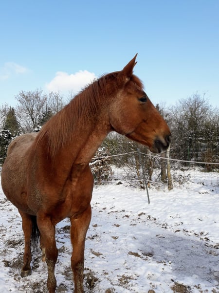 ...mit der 50 % Chance auf Sonderfarbe Roan (Farbwechsler). Warum Sperma - wenn es gleich ein fertiger Embryo sein kann?! Zum Verkauf steht ein Embryo aus der Trakehner Stute Bergkada und dem Vollblüter Leistungsvererber Il Divo xx. Die Stute Bergkada wurde auf der diesjährigen Bundestutenschau in Kranichstein mit dem 1e Preis bedacht. Neben ihrem hervorragenden Pedigree wurde besonders ihr Schritt hervorgehoben: "Jeder Schritt wie der andere, Runde um Runde." Auch im Rahmen ihrer Stuteneintragung konnte sie in den Grundgangarten überzeugen und wurde hier mit den Wertnoten 8, 8, 8 belohnt und auch im Gesamteindruck erhielt sie eine 8. Ihre Abstammung?! Absolut legendär. Namen wie Beg xx, Marduc, Habicht oder Trafaret auf der Hengstseite, sowie die unvergessene Hörsteiner Grande Dame Shynoon zieren ihr Pedigree. Ihre Sonderfarbe Red Roan oder Fuchstichelhaar verdankt sie dem Hengst Bukephalos, der auf den ebenfalls roanfarbenen Insterfeuer zurückgeht. Zur Zeit sind in Deutschland nur zwei Stuten mit diesem seltenen Farbgen zuchtaktiv für die Trakehner. Ein doppeltes Argument: Leistung trifft Farbe! Trotz (oder gerade wegen?) des Leistungsblutes zeigt sich diese Stute absolut unerschrocken und leistungsbereit. Ob Sankt-Martins-Umzug, Kindergeburtstag oder Helikopter-Einsatz auf der Nachbarwiese - dieses Pferd lässt sich durch nichts aus der Ruhe bringen! Das letzte Bild zeigt ihr Trakehner Fohlen aus 2019 von Phlox (Championatsfohlen), das jetzt 6 jährig keine Wünsche als verlässlicher Freizeitpartner offen lässt. Der Vater Il Divo xx, Sohn des Dashing Blade xx, war Reserve-Siegerhengst des „Schaufensters Vollblut“ 2010 in Münster-Handorf. Ein ungmein trockener und großrahmiger Hengst, mit bedeutenden Maßen, viel und korrektem Bein, langen Linien, in klarer Aufteilung seiner Körperpartien. Diese Anpaarung wurde bewusst auch wegen der Schönheit und Noblesse des Hengstes gewählt. Auch seine Exterieur-Points liegen in der Gesamtaufmachung mit komfortablem Schulter-Widerrist-Gürtel und langer, sehr gut angesetzter Halsung, die sich ideal geformt zum Genick hin verjüngt. Il Divo xx ist mit drei hervorragenden, taktsicheren, raumgreifenden und zugleich elastischen Grundgangarten ausstaffiert, die von viel Schulterfreiheit, Vorderbeinaktion gekennzeichnet, immer aus dem aktiven Hinterbein getragen werden. Er kam in drei Rennjahren 15-mal an den Start, davon dreimal siegreich und viermal platziert (GAG 92,5 kg). Eine traumhafte Anpaarung, aus der mehrere Embryonen gewonnen werden konnten. Diese liegen in der renommierten Pferdeklinik Mühlen (Vis á Vis zu Schockemöhle) sicher "auf Eis". Die Spezialisten der Pferdeklinik können die Vorbereitung der Empfängerstute, sowie die erfolgreiche Implantation vor Ort durchführen, Falls keine eigenen geeignete Empfängerstute vorhanden ist, so kann auch bei der Vermittlung geeigneter Empfängertiere seitens der Klinik Hilfestellung geleistet werden. Warum also die Unsicherheit der Besamung in Kauf nehmen - wenn gleich der fertige Embryo mit Traum-Pedigree wartet??!