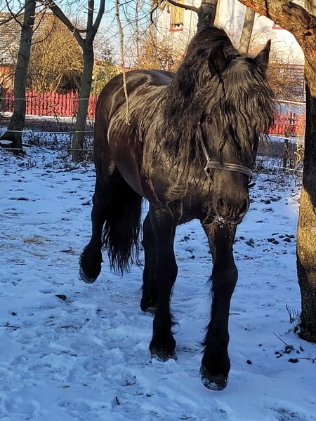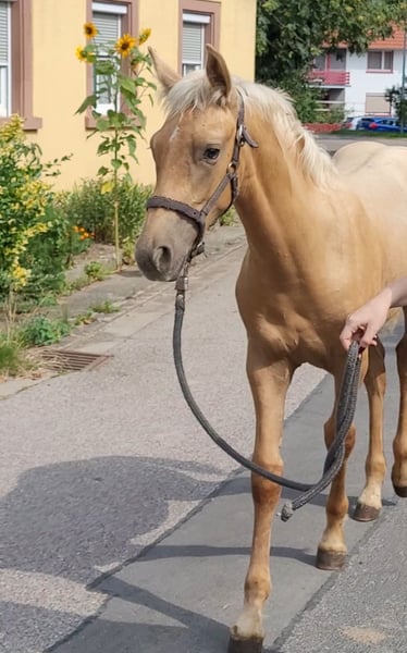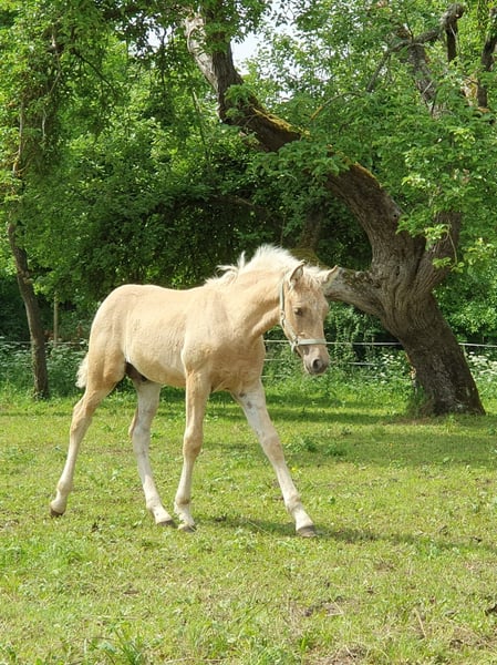 Absolutes Unikat: Unser einzigartiges, ungewöhnlich helles Palomino Warlander Hengstfohlen "Inferno von Greenhorn" mit Papieren vom BZVKS und eingetragen beim internationalen WSS ist schweren Herzens nach langen Überlegungen wegen Bestandsverkleinerung in gute Hände abzugeben. Geboren am 28.03.2025. Inferno wurde als Prämienfohlen eingetragen. Vater: Friese KFPS, Rappe (seltener Fuchsgen-Träger), Stm 167cm, letzte beiden Bilder. Mutter: PRE ANCCE, Cremello (vor Ort zu besichtigen), Stm 153cm, teilweise mit Inferno auf den Bildern. Wird ca 160-165 cm EM und steht schön im barocken Typ. Die Mutter ist ein absolut sitzbequemes Sofa. Augenscheinlich zeigt auch er bequeme Gänge. Vom Vater hat er reichlich Mähne und Schweif geerbt, vermutlich bekommt er auch etwas Kötenbehang. Wunderschönes Köpfchen mit hübschen Augen. Geschwungene Oberlinie. Ein Traum von einem Pferd! Inferno ist gut sozialisiert aufgewachsen in einer gemischten Herde, steht mit einem älteren Wallach, einem gleichaltrigen Fohlen und mehreren Stuten zusammen. Robusthaltung gewohnt, kennt Box, Offenstall und 24-Stunden Weide. Er ist sehr verschmust, menschenbezogen und anhänglich. Regelmäßig entwurmt und geimpft. Kennt bereits den Hufschmied. Artig im Umgang (Führen, Anbinden, Putzen, Verladen). Seine für einen Warlander der ersten Generation äußerst seltene Farbgenetik (ggeeAaCrcr) macht ihn auch für die spätere Zucht interessant, denn er kann theoretisch alle Farben vererben (Buckskin, Brauner, Perlino, Palomino, Fuchs, Cremello, Smoky Black, Rappe, Smoky Cream). Schimmel sind nur möglich, wenn die Stute Schimmel ist, er selbst trägt kein Grey. Nachkommen von ihm würden Warlander Papiere aus folgenden Stuten erhalten: Warlander, Friese, PRE, Lusitano, PRM, Cruzado Iberco (Lusi x PRE). Friese-Iberer(PRE/Lusitano)-Mixe gibt es einige, aber die gezielte und durchdachte Kreuzung mit Warlander Papieren ist noch immer sehr selten - und noch seltener im Verkauf zu finden, ganz besonders einzigartig jedoch in dieser traumhaften Sonderfarbe. Weltweit gibt es nur 3 oder 4 weitere Warlander in dieser für 50% Friese außergewöhnlichen Fuchs-basierten Farbe Palomino. Bitte ausschließlich ernstgemeinte Anfragen. Wir legen großen Wert auf weiteren Kontakt auch nach der Abgabe, möchten seine Entwicklung und Werdegang gerne mitverfolgen. Wird demnächst abgesetzt und kann ab sofort jederzeit ausziehen. Nur in ein absolutes 5*****Zuhause!