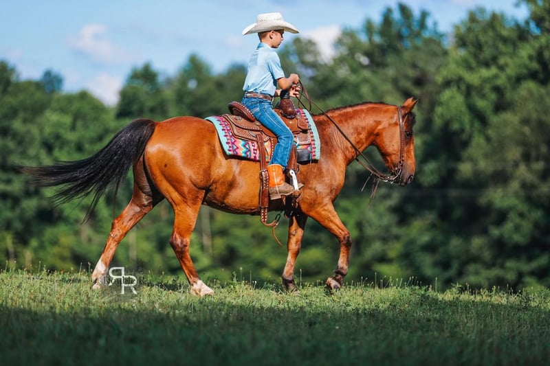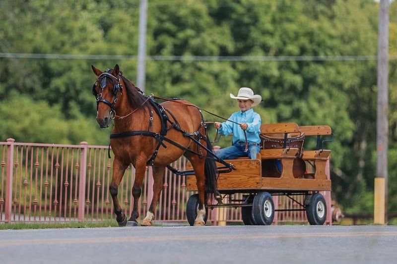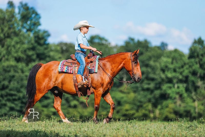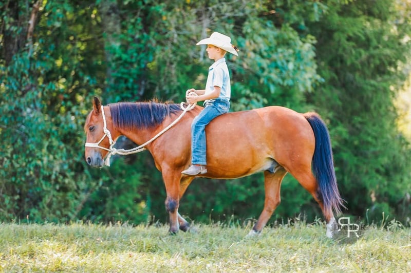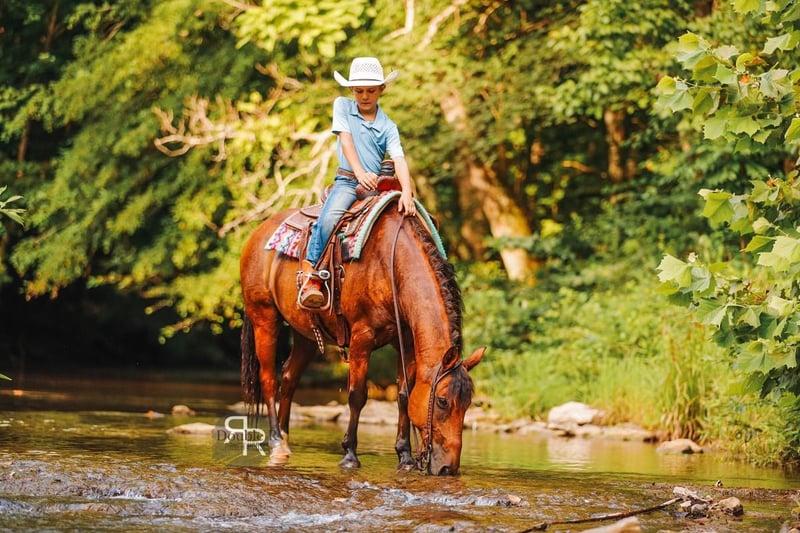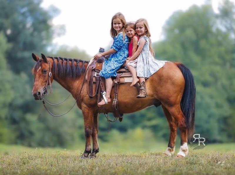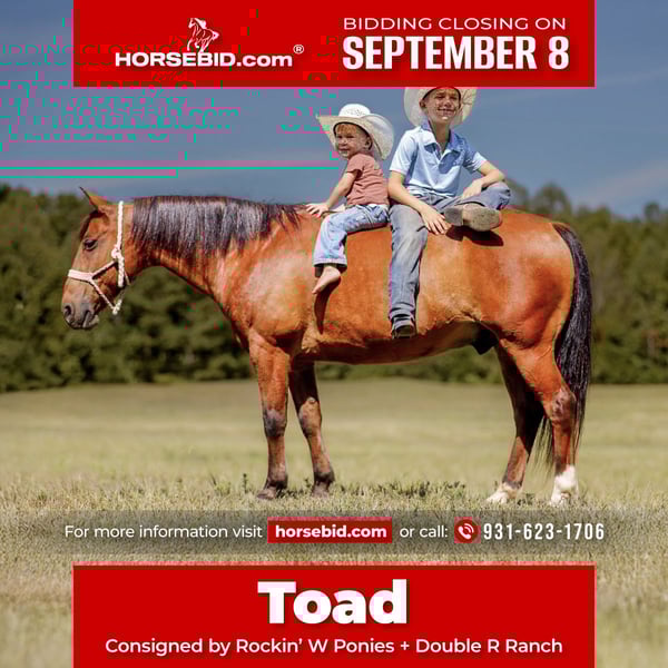♦️ 𝐭𝐡𝐞 𝐒𝐞𝐩𝐭𝐞𝐦𝐛𝐞𝐫 𝑺𝒆𝒍𝒆𝒄𝒕 ♦️ Happening now thru MONDAY | SEPTEMBER 8th - Available EXCLUSIVELY on HorseBid's website! For more details and to register visit: www.Horsebid.com CONSIGNOR CONTACT: Rockin’ W Ponies + Double R Ranch 931-623-1706 LOCATION: Lyles,TN BREED: Welsh Pony REGISTERED: No COLOR: Bay HEIGHT: 50” AGE: 11 GENDER: Gelding Meet Toad! This sweet bay Welsh pony gelding is the definition of safe, steady, and dependable. He is 11 years old, old enough to be incredibly settled and sane- and young enough to last your kiddos and grandkids as long as they want to ride. Standing at 50” tall, Toad is the perfect size kids pony, and hands-down the safest and most reliable we’ve ever had the pleasure of owning. As parents, we know there’s nothing more valuable than peace of mind when it comes to turning your kids loose on their own pony. Toad gives you exactly that. He’s the one you can saddle up, hand the reins to your child, and breathe easy knowing he’s going to take care of them every single time. He’s patient, honest, and never gets sour. He just quietly does his job and makes kids feel like champions. Before coming to us, Toad spent his life as an Amish family school pony, faithfully toting children to school every day- sometimes in a buggy, sometimes in a wagon, sometimes with a little one on his back. That daily work gave him a lifetime of exposure and an unshakable foundation. He’s seen it all; traffic, dogs, farm equipment, bicycles, busy roads- and handles everything with quiet confidence. He drives beautifully, is excellent and easy to guide, and is just as steady under saddle! He has had invaluable experience, and it shows in every quiet step. On the trail, in the arena, or just poking around the pasture, Toad is a steady-eddy. He’ll cross water, step over logs, ride alone or in a group, and he never rushes or gets fussy. He’s the kind of pony who makes both beginner riders and seasoned horsemen appreciate just how rare he is. He is point-and-shoot style, user friendly and honest as the day is long. He’s given more than a few lessons, and he instills calmness with his easy going attitude. On the ground, he’s just as kind. Easy to catch, happy to be groomed, stands for the farrier and vet, patient with little hands brushing and fussing over him. He loves attention and is always gentle and kind. Toad is the kind you hang on to forever. He wouldn’t be for sale- except for the fact that we already have an old sentimental pony for our family, and we know Toad deserves to go make another set of kids as happy and safe as he’s made ours, their cousins and various other kids who have shown up and needed to feel safe for their first ride! If your checklist includes safe, sound, sweet, beginner-proof, and PARENT APPROVED, Toad checks every single box!! He’s a once-in-a-lifetime pony, the kind parents dream of for their children. These are SO rare, and I highly suggest not letting this one get away. He sells 100% sound with a completed Pre-Purchase Exam from Todd County Animal Clinic (Dr. John Laster, DVM). 📍 Located in Lyles, TN. Nationwide shipping available—we’re happy to help arrange transport. For more info or to schedule a visit, contact Rachel Vick at 931-623-1706.