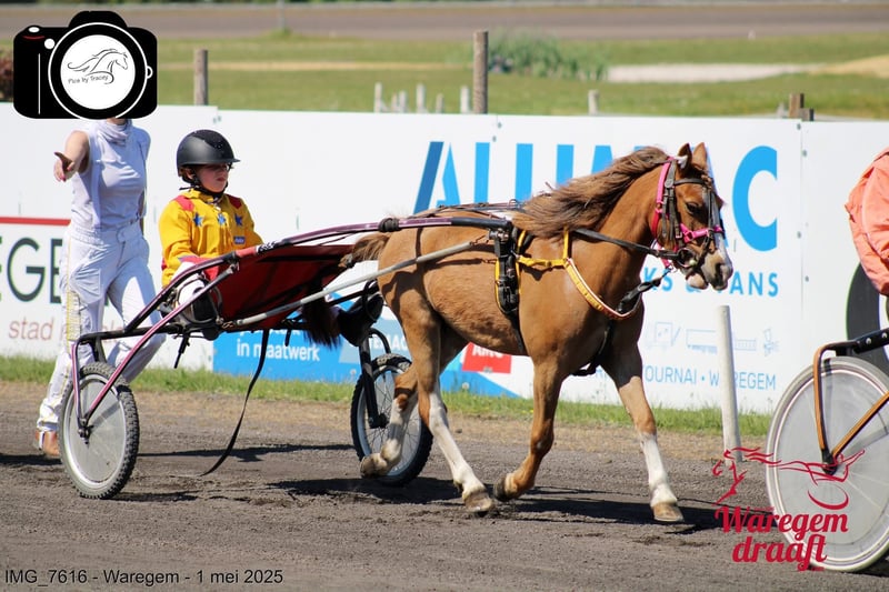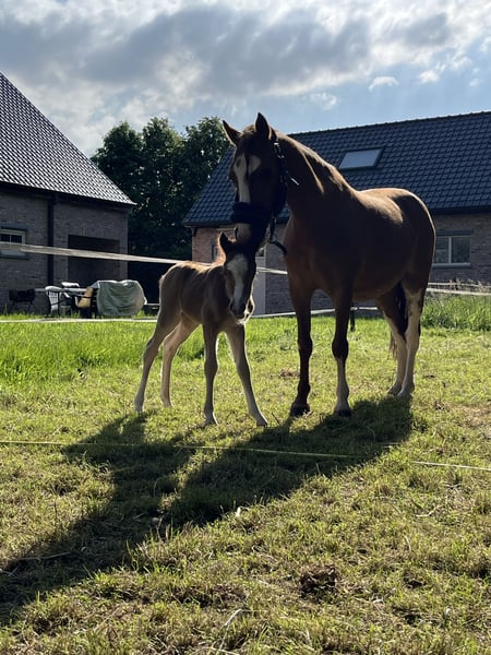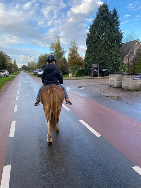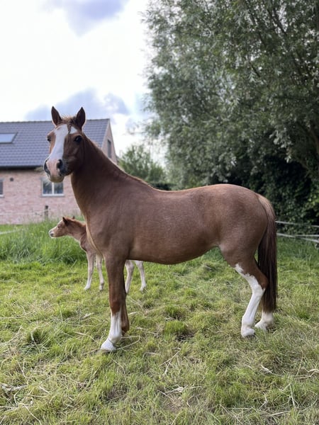 Kalama is a chestnut Welsh-A pony mare, standing at 1.17 meters at the withers. In the past, Kalama was used in a very versatile manner. She has been ridden, participated in liberty dressage, often went on outdoor rides, attended riding lessons at the riding school, and even competed in a few trot races in a sulky. Kalama has also foaled twice. On both occasions, she was the perfect picture: a smooth, easy delivery and a very attentive, protective mother to her foals.