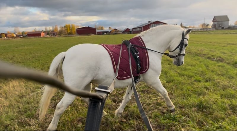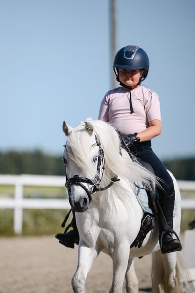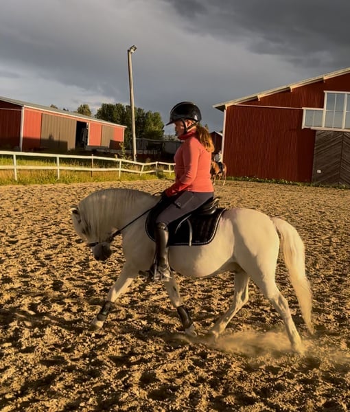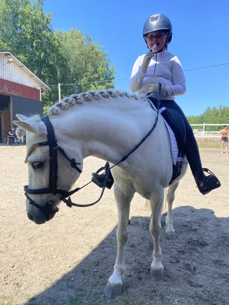 Mojito is een dressuurpony met mooie gangen en veel talent, met voldoende kwaliteit om samen met een nieuwe jonge ruiter ver te komen. Door de focus van ons gezin op dressuur heeft hij weinig gesprongen, maar hij kan wel kleine parcoursen springen. Hij is ideaal om mee buiten te rijden, verkeersmak en gewend aan landbouwmachines, dravende paarden en honden. Ook zou hij het goed kunnen doen in de mensport. Hij is een vriendelijke en verstandige pony die altijd naar je toe komt. Tijdens het rijden is hij energiek, waardoor hij minder geschikt is voor de allerkleinste kinderen om alleen te rijden. Het is een lieve, goedhartige pony die ons elke dag laat glimlachen. Hij heeft geen stalgebreken, reist gemakkelijk en gedraagt zich voorbeeldig op training en op wedstrijd. Hij is al bijna 4 jaar deel van onze familie en een dierbare trainingspartner van onze dochter. Samen hebben ze dressuur getraind en zijn ze gegroeid tot B-niveau (vergelijkbaar met L2 in Nederland), hebben ze deelgenomen aan kleine wedstrijden en getraind in de regionale trainingsgroep van de Finse paardensportfederatie. Onze dochter is hem inmiddels ontgroeid, en we hopen dat Mojito de dromen van een volgende jonge ruiter kan waarmaken!