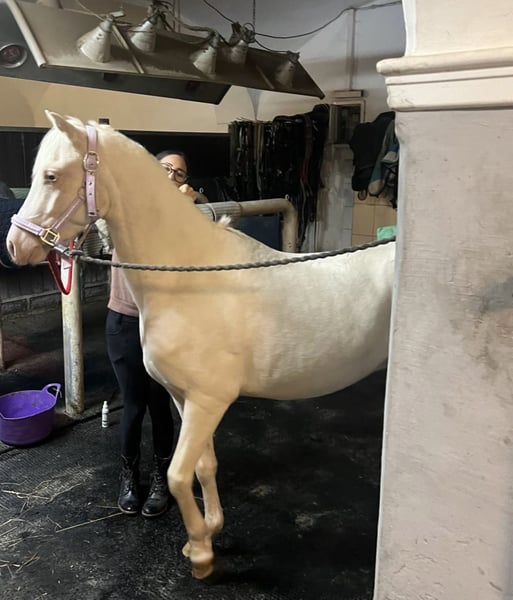 **Annonce de vente : Magnifique hongre Welsh-B à vendre** Nous proposons à la vente un magnifique hongre Welsh-B. **Caractéristiques :** - **Race :** Welsh-B - **Sexe :** Hongre - **Année de naissance :** 2019 - **Couleur :** Cremello - **Taille :** 135 cm - **Domaine d'activité :** Dressage Ce charmant hongre séduit non seulement par sa couleur frappante, mais aussi par son caractère amical et sa volonté d'apprendre. Il se comporte très bien en compétition et peut être facilement manipulé par les enfants. Il connaît les spectacles de Noël, a participé à divers événements pour enfants et se montre docile pour les débutants en longe.