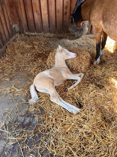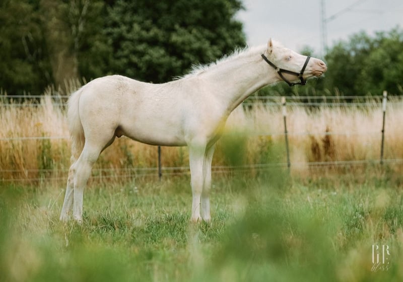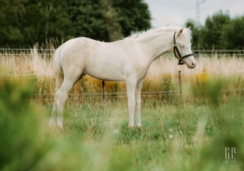 Lindos Blue ist ein wunderbar im Welsh Pony Typ stehendes Hengstfohlen mit bester Bewegung und Ausstrahlung in Sonderfarbe. Hier kommt die bewährten Gregory Linie mit bestem Leistungsblut von Riehenhofs Lando (v. Woldbergs Leonardi) zusammen. Alle Halb- und Vollgeschwister gehen zuverlässig mit Kindern, unter kleinen Erwachsenen in den höheren Klassen Dressur und erfolgreich vorm Wagen. Die Mutterstute ist eine unserer nervenstärksten und verlässlichsten Ponys und geht auch in der Reittherapie. Sie ging bereits erfolgreich im Ein- und Zweispänner (zusammen mit der Mutterstute) Dressur und Marathon bis Klasse L. Lindos ist ein sehr präsentes, mutiges und freundliches Fohlen mit dem Herz am rechten Fleck. Er weiß sich zu präsentieren und ist immer für neue Dinge zu haben. Auf den Fohlenbildern sieht man seine schönen Abzeichen und die besondere Blesse. Weil er so dunkel war, gehen wir davon aus, dass er ein Perlino ist (doppelt aufgehellter Brauner), mindestens jedoch ein Cremello. Ein genauer Farbtest ist natürlich möglich. Mit dem Fellwechsel wurde er nun hell. Lindos steht auf einem sehr kräftigen und korrektem Fundament, mit starkem Rücken und Hals. Er ist Prämienfohlen und hat sich zum Fohlenchampionat qualifiziert, wo er Höchstnoten erhielt. Sein Vater Riehenhofs Lando überzeugte kürzlich bei seiner HLP mit einer 8,85 in Offenbüttel, ist Prämien- und Leistungshengst und steht bei uns auf Station. Er stammt ab vom hoch erfolgreichen Woldberg‘s Leonardi, der 2023 bei der FN-Bundeshengstschau auf der Grünen Woche in Berlin zum Bundes-Reservesieger im Schauwettbewerb der Welsh Ponys (Sektion B) gekürt wurde und die FN-Bundesprämie erhielt. Die letzten Bilder zeigen die Mutterstute in unserer Ponyschule und vorm Wagen, sowie unseren Prämienhengst Riehenhofs Lando, der Fremdstuten in 2026 im Natursprung zur Verfügung steht. Lindos wächst gemeinsam mit seinem Halbbruder in unserer Wallachherde auf, tobt und spielt im Offenstall und auf der Weide. Er ist durch die erwachsenen Pferde bestens sozialisiert und genießt das Leben gemeinsame Spielen sehr. Sein starkes Fundament und hoher Halsansatz zeigen seinen schönen Hengsttyp - dem Vater aus dem Gesicht geschnitten. Regelmäßig entwurmt und mit bestem Fohlenfutter versorgt. Er kennt das Fohlen-ABC, geht brav am Halfter, kennt Hufe geben und anbinden. In unserem Betriebsalltag lernt er alles, was ein zukünftiges Kinder- und Fahrpony kennen sollte. Ein Pony mit besonderem Look, dem alle Türen offen stehen und das die Welt gemeinsam mit der Familie entdecken möchte! Er ist abgesetzt und könnte ab sofort in ein neues Heim ausziehen. Wir wünschen uns für ihn (Welsh-) Pony erfahrene Menschen oder Züchter, die sich mit der Aufzucht und Ausbildung von Jungpferden auskennen oder bei dieser Aufgabe von erfahrenen Personen unterstützt werden. Alles weitere besprechen wir gern telefonisch oder vor Ort und freuen uns auf Eure Anfrage - man kann über alles sprechen! Nicht nur merken - auch anrufen - wir beißen nicht :) Keine Ratenzahlung. Wir bieten keinen Aufzuchtsplatz vor Ort. We speak english! Ponys aus Heimsen - www.ponyschuleheimsen.de