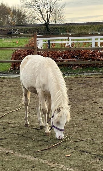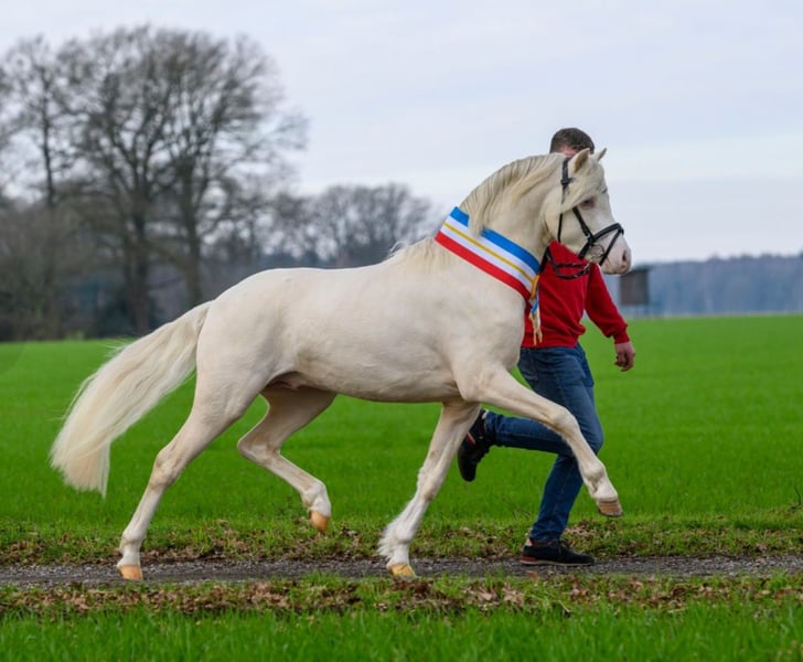 Lindos Blue is a beautifully built Welsh Pony type colt with excellent movement and presence, distinguished by a special coat color. He comes from the proven Gregory line, combined with top performance bloodlines from Riehenhof’s Lando (by Woldbergs Leonardi). All half- and full-siblings reliably go well with children, work successfully in higher-level dressage classes under small adult riders, and are also experienced in driving. The dam is one of our most resilient and reliable ponies, often used in equine-assisted therapy. She has already competed successfully in single and pair driving, dressage, and marathon events up to class L, together with her dam. Lindos is a very confident, brave, and friendly foal with a heart in the right place. He knows how to present himself and is always open to new experiences. In the foal pictures, you can see his beautiful markings and the distinctive blaze. Due to his dark color, we believe he is a perlino (double-lightened brown), or at least a cremello. A precise color test is naturally possible. With his coat change, he has now become lighter. Lindos stands on a very strong and correct foundation, with a powerful back and neck. He is a premium foal and qualified for the foal championship, where he received top scores. His sire, Riehenhof’s Lando, recently impressed at his licensing with a score of 8.85 in Offenbüttel. He is a premium and performance stallion standing at our station. He descends from the highly successful Woldbergs Leonardi, who was named Bundes-Reservesieger in the Welsh Pony (Section B) show competition at the 2023 FN Federal Stallion Show on the Green Week in Berlin and received the FN Federal Premium. The last photos show the dam in our pony school and in harness, as well as our premium stallion Riehenhof’s Lando, who will be available for natural cover from external mares in 2026. Lindos is raised together with his half-brother in our gelding herd, playing and frolicking in the open stable and on the pasture. He is well socialized with adult horses and enjoys the company of others during play. His strong conformation and high neck set reflect his beautiful stallion type—closely resembling his father. He is regularly dewormed, fed with excellent foal feed, and familiar with basic handling: leading on halter, picking up hooves, and tying. In our daily farm routine, he is learning everything a future children's or driving pony should know. A pony with a distinctive look, with all doors open to him, eager to explore the world with his family! He is gelded and can move to a new home immediately. We are looking for experienced pony people or breeders, ideally familiar with raising and training young horses, or those supported by experienced mentors. We are happy to discuss further details by phone or in person and look forward to your inquiry—everything is open for discussion! Don’t just remember—call us! We don’t bite :) No installment plans. We do not offer on-site raising facilities. We speak English! Ponies from Heimsen – www.ponyschuleheimsen.de