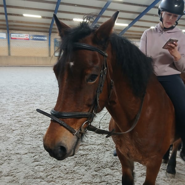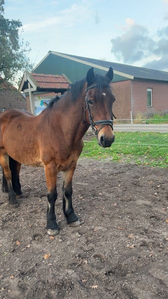 d pony te koop 12 jaar. Welsh cob. 1.47m .een ruin. Niet geschikt voor jonge onervaren ruiter/amazone. Die gaat hij uitproberen. Maar ben je wat ervaren is er niets aan de hand. Laatste jaar niet veel gereden. Maar het is opstappen en rijden, ook buiten. Hij is makkelijk te laden op de trailer. Houd ook van een sprongetje. Braaf bij de hoefsmid. In het verleden beslagen, maar nu al lang niet meer. Heeft sterke hoeven. In het verleden ook voor de kar gereden.