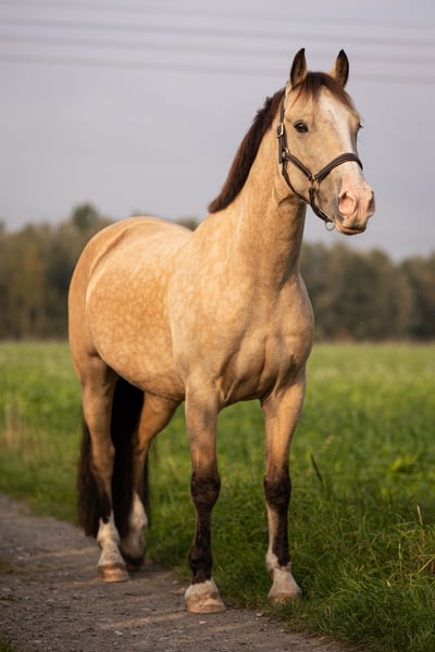 Z ciężkim sercem oferuję mojego spokojnego i wspaniałego wałacha Welsh Cob. Rasa: Welsh D Kolor: Dąbrówka złota / Gold Dun Rok urodzenia: 2019 Wzrost: 146 cm Arvalon Monteverdi jest młodym koniem, odpowiednim dla młodych jeźdźców, i wychował się na stadnisku Arvalon nad Bałtykiem / Damlos. W 2022 roku, mając 3,5 roku, trafił do mnie i od tego czasu jest wiernym towarzyszem o doskonałej chęci do pracy. „Fred” ma łagodny, szczery i pracowity charakter. To idealny kompan dla osób poszukujących niezawodnego i bezproblemowego konia – zarówno jako przyjaciel na co dzień, jak i partner sportowy. Jest z jednej strony zrównoważony i spokojny, z drugiej łatwo zmotywować go do wszelkiego rodzaju pracy czy zabawy. Fred jest bardzo zmotywowany i typowo „Welsh- sprytny” w pracy na lonży, pod siodłem, nauce trików, treningu spokoju, pracy wolnej, itd. Zawsze stara się robić wszystko poprawnie, jest wrażliwy i skupiony na „swoich” ludziach. Chętnie i spokojnie (również samodzielnie, dotychczas na lonży) wchodzi w teren, a na placu treningowym, zarówno na zewnątrz, jak i w hali, pracuje bez zbytniego rozpraszania się na bodźce z otoczenia. Przeszliśmy z nim bardzo staranną, delikatną i zawsze z myślą o jego dobru jazdę. Wykazuje się dużą motywacją i ma potencjał, aby stać się idealnym partnerem zarówno dla ambitnego jeźdźca rekreacyjnego, jak i w sportach. Ponieważ jego poziom wyszkolenia to obecnie „zaczęty”, nie jest odpowiedni dla początkujących i wymaga jeszcze dalszej pracy. Jest zawsze w doskonałym stanie zdrowia, regularnie pokazywany u kowala (na kopytach), odrobaczany i szczepiony. Zęby kontroluje i pielęgnuje weterynarz. Obecnie mieszka w paddock boxie z dodatkowymi 10-12 godzinami dziennie na pastwisku / paddocku z innymi końmi. Oddaję go jedynie ze względu na moją ciążę i nadchodzący brak czasu, i życzyłabym sobie dla niego prywatnego, kochającego miejsca z wystarczającym wybiegiem, gdzie mógłby ponownie być numerem 1. Chętnie opowiem więcej o tym wspaniałym koniu i odpowiem na każde pytanie. Kontakt telefoniczny lub przez WhatsApp: 01511 4433939 Lokalizacja: Gelsenkirchen
