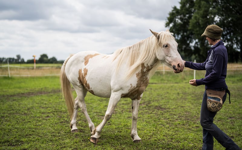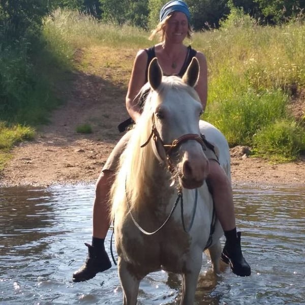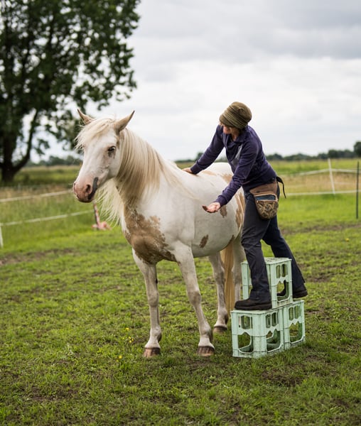 Cleo ist ein Welsh Cob x englisches Warmblut (mit Equidenpass), 07/2014 in Wales geboren, 153cm groß, 06/2021 roh importiert und zu mir gekommen. Sie ist sehr gesund und robust und hat eine kräftige Statur. Da sie halb wild bei mir ankam, habe ich mir viel Zeit in Beziehungsaufbau und der Arbeit am Boden genommen, mit Elementen der akademischen Reitkunst, des Horsemanship, Clickertrainings und einer guten Grunderziehung. Hänger und Hufbearbeitung (barhuf) sind kein Problem. Sie geht gut als Handpferd am Pferd oder am Fahrrad mit und ist nicht schreckhaft. Sie bleibt überall brav unangebunden stehen, wenn der Strick auf dem Boden liegt. Sie wurde im Herbst 2022 angeritten und wurde bis 08/2023 regelmäßig im Gelände geritten. Sie ist sehr freundlich, vor allem mit Kindern, ängstlichen und bedürftigen Personen sehr zugewandt und achtsam. Cleo bindet sich eng an ihre Bezugsperson, die ihr sehr viel Sicherheit geben kann. In der Pferdeherde ist sie rangniedrig und sozial. Aufgrund einer starken Schmerzreaktion beim Reiten wurde ein Rötgenbild gemacht und Kissing spines diagnostiziert. Sie wurde mit guten Training geritten. Ich möchte sie aber nicht als Reitpferd abgeben, aber auch nicht als Beistellerin. Sie ist ein wunderbares Pferd, dass eine Aufgabe bekommen sollte. Sie hat sehr viel Potenzial in der therapeutischen Arbeit, da sie gut spiegelt, interessiert und sehr vorsichtig im Umgang ist. Auch für die akademische Reitkunst, Zirzensik und andere Aufgaben, in denen es um feine Kommunikation geht, ist sie ein Traum. Mit ihrer vollen Mähne, den zweifarbigen Augen und dem schönen Kopf hat sie eine ätherische Schönheit und verzaubert die Menschen. Das Elfenpferd zieht besonders Kinder, mit ihrer Optik und ihrer sanften Art an und flößt so Vertrauen ein. Ich gebe Cleo nur ab, wenn ich den wirklich passenden Menschen für sie finde. Erfahrung mit der Ausbildung von Pferden, pferdegerechte Haltung und Umgang sind Voraussetzung. Ein Platz in dem sie therapeutisch oder pädagogisch wirken kann und die Anerkennung bekommt, die sie verdient, wird bevorzugt!