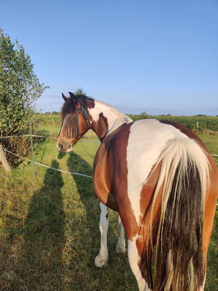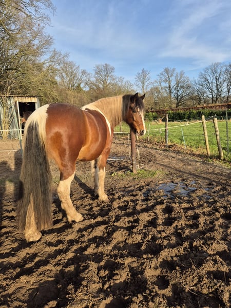 Mit schwerem Herzen suchen wir ein neues Zuhause für Bonnie. Wir können ihr leider nicht bieten, was sie braucht, und wünschen ihr ein liebevolles und fürsorgliches Zuhause. Bonnie (im Pass Gaby genannt) ist eine wunderschöne, achtjährige Scheckstute mit einem goldenen Herz für diejenigen, die ihr Vertrauen gewinnen. Sie ist etwa 1,45 m groß. Sie ist eine echte Schmusebacke; im Alltag kommt sie regelmäßig, um gestreichelt und geküsst zu werden. Bei neuen Menschen kann sie anfangs etwas unsicher sein, aber sobald die Chemie stimmt, ist sie eine treue Begleiterin fürs Leben. Bonnie liebt Ausritte in der Natur. Sie fühlt sich im Gelände am wohlsten und geht entspannt mit. Ob in einer Gruppe oder allein (wobei sie Letzteres anfangs noch etwas spannend findet). In der Gruppe ist es wichtig, ihr Tempo gut zu kontrollieren; wenn es zu schnell wird oder sie durch Umgebungsfaktoren unsicher ist, kann sie nervös werden, was sich in Buckeln äußern kann. Im Roundpen reiten macht ihr nicht so viel Freude. Dabei wird sie manchmal nervös und verweigert den Gang. Mit einer guten Ausbildung könnte man das vielleicht noch verbessern, wir haben es nicht ausprobiert und haben die gemeinsamen Ausritte genossen. Trotz vieler Ausritte läuft sie barfuß. Beim Schmied ist sie brav. Letztes Jahr hatte Bonnie Muskelverspannungen, vermutlich durch ein nicht optimal sitzendes Sattel bei ihrem Vorbesitzer. Sie wurde deshalb physiotherapeutisch behandelt. Sie erhielt Lasertherapie und Akupunktur, was ihr Erleichterung verschaffte. Seit Frühling läuft sie wieder gut. Gelegentlich zeigt sie Zungezeigen, vor allem in Situationen rund um die Fütterung. Das ist aber selten und hat keine medizinischen Folgen. Bonnie zeigt typisches Stutenverhalten. Täglich erhält sie CBD-Tropfen, die ihr helfen, ihre Hormone auszugleichen, wodurch sie jetzt weniger reagiert. Sie steht bei uns getrennt von den Wallachen. Für wen ist Bonnie geeignet? Bonnie sucht eine erfahrene, ruhige, aber selbstbewusste Besitzerin oder einen Besitzer, der ihre Unsicherheiten versteht und ihr Zeit gibt, Vertrauen aufzubauen. Sie fühlt sich am wohlsten in einer stabilen Umgebung mit klaren Grenzen und einer konsequenten, aber freundlichen Hand. Für jemanden, der gerne Ausritte macht und ein Pferd mit liebevollem Charakter sucht, kann Bonnie eine wundervolle Partnerin sein. Sie ist kürzlich geimpft und entwurmt. Sie ist brav im Hänger und läuft problemlos darauf. Bei Interesse an weiteren Informationen, Fotos oder Videos, senden Sie bitte eine private Nachricht. Der Preis ist bei einem guten Zuhause verhandelbar.