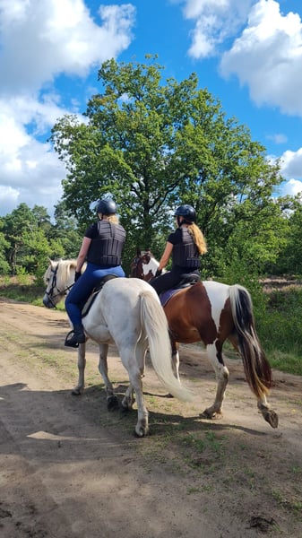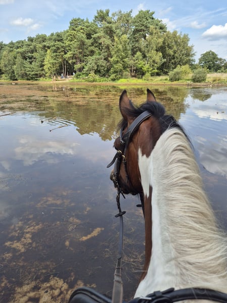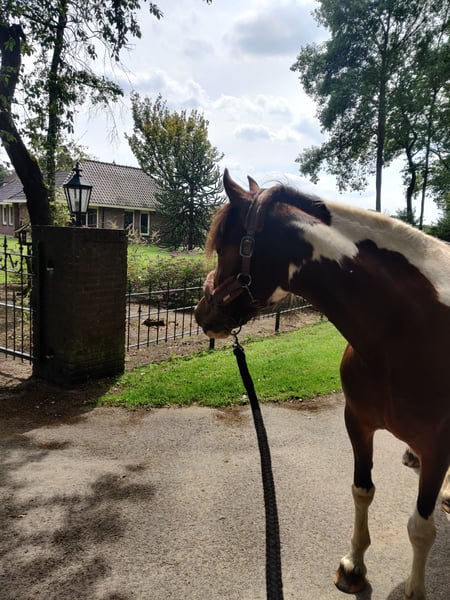 Met pijn in ons hart zoeken wij een nieuw huisje voor Bonnie. We kunnen haar helaas niet bieden wat ze nodig heeft en gunnen haar een gouden huisje. Bonnie (op paspoort Gaby) is een prachtige 8-jarige bonte merrie met een gouden hart voor degene die haar vertrouwen wint. Ze meet ongeveer 1.45 meter. Ze is een echte knuffelkont; tijdens de dagelijkse klusjes komt ze regelmatig vragen om kriebels en kusjes. Bij nieuwe mensen kan ze wat onzeker zijn, maar zodra de klik er is, heb je een maatje voor het leven. Bonnie geniet ontzettend van buitenritten. Op buitenrit voelt zij zich het prettigst en loopt ze ontspannen mee. In een groep of alleen (dit vindt ze in het begin nog wel spannend). In een groep is het belangrijk dat haar tempo goed bewaakt wordt; wanneer het haar te snel gaat of als ze onzeker wordt door omgevingsfactoren kan ze gespannen raken, wat zich kan uiten in bokken. In de bak rijden doet ze niet graag. Hiervan raakt ze gespannen waardoor ze gaat staken. Wellicht is dit met goede training eruit te rijden, wij hebben dit niet gedaan en lekker van haar genoten op buitenrit. Ondanks de vele buitenritjes loopt ze op blote voeten. Ze is braaf bij de smid. Bonnie heeft vorig jaar last gehad van stijve spieren, waarschijnlijk vanwege een niet goed passend zadel bij de vorige eigenaar. Hiervoor is ze door een fysiotherapeut behandeld. Ze heeft lasertherapie en acupunctuur gehad, wat haar verlichting gaf. Ze loopt nu sinds het voorjaar goed. Af en toe kan ze luchtzuigen, vooral op momenten rondom voer. Ze doet dit niet veel en ervaart hier geen medische gevolgen van. Bonnie vertoont merrie gedrag. Ze krijgt dagelijks CBD-druppels; deze druppels helpen haar hormonen balanceren waardoor ze nu minder fel reageert. Ze staat bij ons apart van de ruinen. Voor wie is Bonnie geschikt? Bonnie zoekt een ervaren, rustige, maar zelfverzekerde eigenaar die haar onzekerheden begrijpt en haar de tijd wil geven om vertrouwen op te bouwen. Ze functioneert het best in een stabiele omgeving, met duidelijke grenzen en een consequent maar vriendelijk iemand. Voor iemand die graag buitenritten maakt en op zoek is naar een paard met een liefdevol karakter, kan Bonnie een fantastisch maatje worden. Ze is recent geënt en ontwormd. Braaf op de trailer, loopt er zo op. Voor meer informatie, foto's en video's, stuur een privébericht. Prijs is voor een goed huisje bespreekbaar.