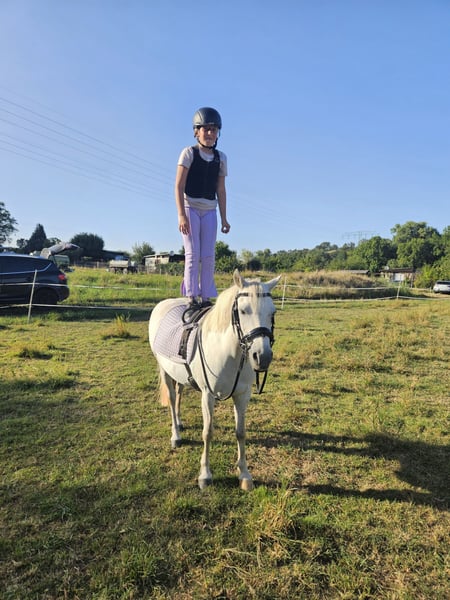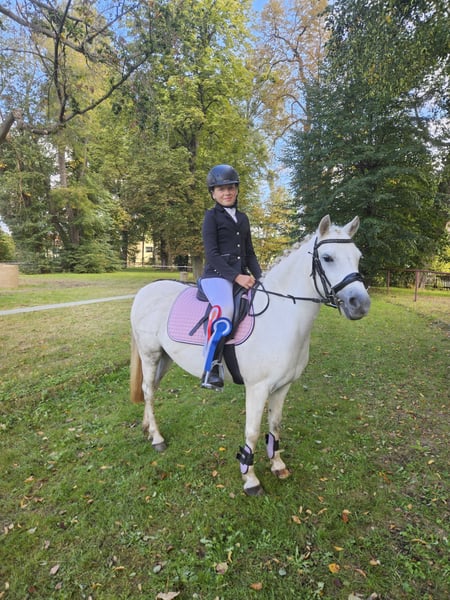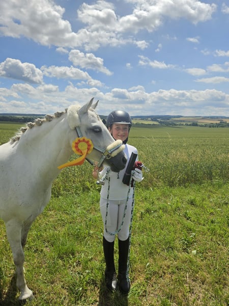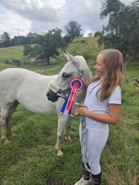 We are looking for a new home for our Trinket, as her rider has unfortunately grown too tall for her. Trinket is a genuine children’s pony that is always ready for fun. She learns very quickly and can even perform a few small tricks. Under saddle, she is equipped with Go, but she remains calm and careful to look after her young rider. She loves jumping, especially cross-country. Trinket is registered as a competition pony and has regularly participated in shows from lead-rein classes to small cross-rail jumps and walk-trot-canter dressage tests. She is comfortable riding alone or in a group in the field. She is always fearless and relaxed during turnout. We have also lunged her in harness and attached a tire, which she handled very calmly on her first try. I can also easily imagine her as a carriage pony. We purchased her at the age of four. She has never been seriously ill, is very gentle with the farrier and veterinarian, and loads and unloads from the trailer independently. Two years ago, Trinket had a beautiful filly. She accepted her immediately, and the birth went smoothly. She is also a very good mother. Since she was registered as a Welsh PB, she is only listed in the preliminary register of the German Riding Pony studbook. The filly can be viewed. We are seeking a loving home for Trinket, where she can once again be the center of attention and bring joy to a young person. She is not for sale to dealers or riding schools. Trinket can be sold with tack and accessories at an additional cost.