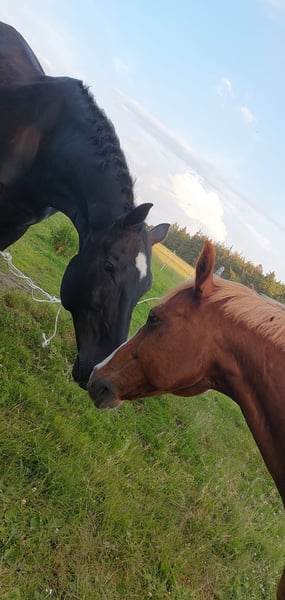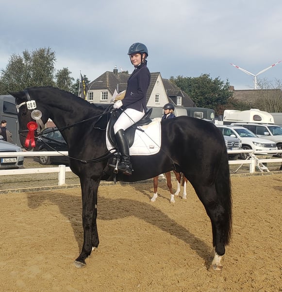 Dario is a wonderful dressage horse. Our daughter has mastered the journey from rider competitions with draw reins to her first Dressage Rider L level with him. He has carried her through the Riding Badge RA 5 and RA 4. They have also completed various team dressage tests together. Under saddle, he is absolutely reliable and calm. The hustle and bustle of competitions does not impress him. Due to his good training up to class M, my daughter was able to learn many lessons. These can be easily called upon with the correct aids. He is not a self-starter but wants to be ridden. We have not further promoted jumping and have focused more on gymnastic work. He has participated in some jumping competitions and small courses in training according to WBO standards. When out riding, he requires a confident rider. - Shoed on all four hooves - Fully vaccinated for competitions - Familiar with open stable and box with paddock - He is in a mixed herd, but we can also imagine him very well in a gelding herd - Teeth regularly checked - He needs routines and a certain level of confidence from the handler - Ideal horse for a parent-child duo - Due to his height, the rider should be over 1.65 m tall - A gem for dressage enthusiasts from A-M or for a learning rider transitioning from WBO to LPO