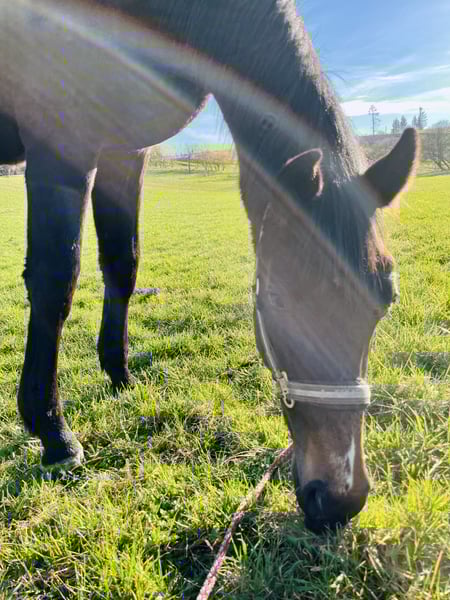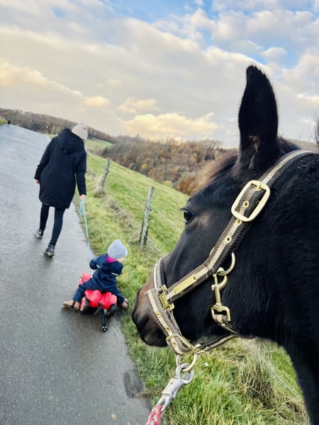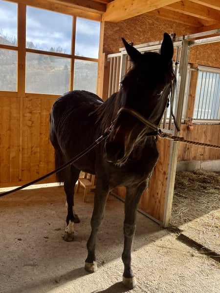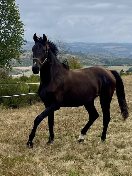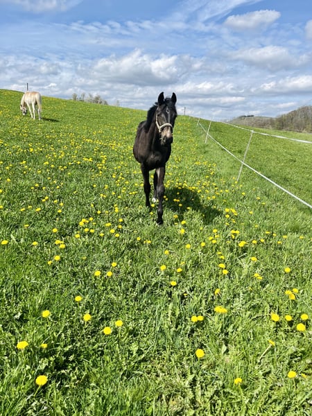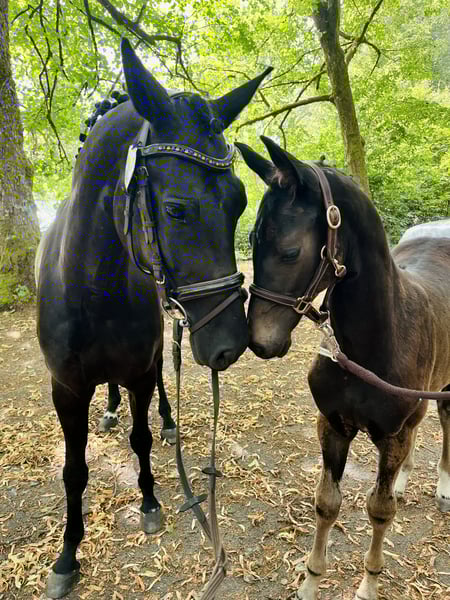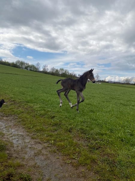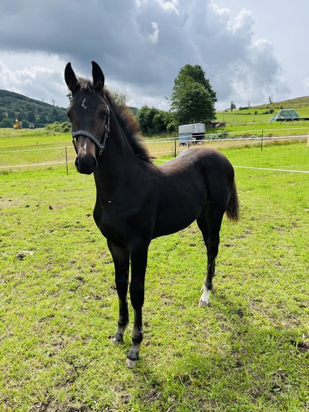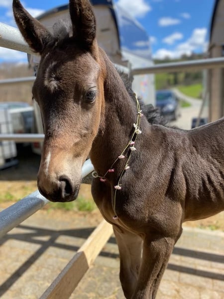 Name: Clemens Geboren: 19.04.2023 Geschlecht: Wallach Stockmaß: aktuell 165cm Rasse: Westfale Farbe: Dunkelbraun Vater: Captain Jack – überzeugt durch hervorragende Rittigkeit und ist erfolgreich bis S*** Mutter: Stute von Balou du Rouet – Siegreich bis Klasse L Beschreibung: Clemens ist ein großrahmiger, ausdrucksstarker junger Wallach mit sehr guter Abstammung und viel Präsenz. Er überzeugt durch energische, elastische Bewegungen sowie eine beeindruckende Ausstrahlung. Bereits als Fohlen wusste er zu begeistern und wurde 2023 auf der Fohlenschau mit der Goldfohlenprämie ausgezeichnet. Er ist hier geboren und aufgewachsen und kennt den familiären Hofalltag von klein auf. Clemens ist gemeinsam mit kleinen Kindern, Ponys und andern Pferden, Schleppern, Hunden, Katzen sowie Kühen groß geworden und zeigt sich im Umgang mit sämtlichen Umweltreizen absolut gelassen und unerschrocken. Im täglichen Umgang präsentiert sich Clemens brav, stets bemüht und interessiert. Ein absoluter Traumjunge, der mit seinem freundlichen, ausgeglichenen Wesen begeistert. Aktuell ist Clemens barhuf, gechipt, regelmäßig entwurmt, geimpft und wurde im April 2025 kastriert. Sonstiges: • Gegen Aufpreis kann Clemens im Frühjahr hier schonend angeritten werden • Optional besteht die Möglichkeit, ihn anschließend noch ein halbes bis ¾ Jahr gemeinsam mit seinem Kumpel auf der Weide aufwachsen zu lassen • Abgabe ausschließlich in liebevolle, erfahrene Hände Standort: 57319 Bad Berleburg