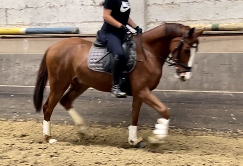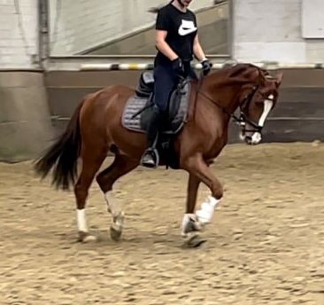 Heartbreaker for sale! 3-year-old chestnut gelding (registered as Dark Chestnut), born March 2022, currently approximately 1.59 m, three outstanding gaits, top dressage pedigree and fantastic character, well-behaved and confident, good in contact. Under saddle since early June and currently in training as a riding horse. He is an ideal young horse for smaller ladies/gentlemen or aspiring riders and has the potential to become a top dressage horse with proper training. More information and videos gladly available upon request via email or phone/WhatsApp. Location: North Rhine-Westphalia (Cologne). Private sale, current price negotiable, price will increase with further training.