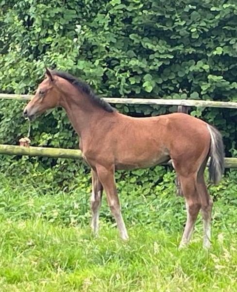 For Celebration PTW was born on 01.05.2024. This is a very strong type filly with 3 above-average basic gaits. Top developed, friendly, people-oriented character. She knows the foal ABC and could move into her new home from November. Current location is 48565 Steinfurt. The foal can be viewed there by appointment. Details of the dam line: The dam of the foal is our Westphalian StPrSt. Emirates GV (Escolar/ Breitling W/ Christian Prince xx), born in 2014. She won a 1d prize at the Eliteschau Westfalen 2017, passed her SLP with a dressage final score of 8.1 in Münster/Handorf 2017, was victorious in dressage tests for young horses up to elementary level internationally and is trained up to medium level. Due to Corona, she switched to breeding at the age of 6. In 2022 and 2024, Emirates GV produced typey fillies with very good gaits by Lilliano OLD and this same For Dance. There are no known health issues with the dam, she is rideable. Granddam Burj al Arab was auctioned off at the CHIO Aachen at a high price and ran up to PSG/Inter I under Mrs. Max-Theurer. Burj al Arab's granddam Zoliante produced the licensed full brothers Dream of Heidelberg I and II (both by Donnerschlag), the latter of which was part of the British Olympic squad under Emile Faurie. The currently highly successful Dutch Lady Reveil line includes Le Maitre (by Lanciano), Wer Weiß (by Wall Street), Del Vento (by Donnerwind), Agilan (by Abanos), Rialto and Richellieux As (both by Riccione) as well as numerous other licensed stallions and sport horses. Our filly therefore comes from a performance-tested and healthy dam with the best pedigree in her background. Please contact us if you are interested.