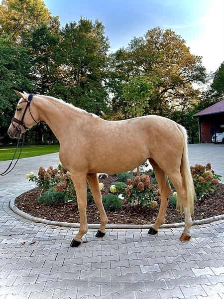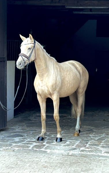 On behalf of the owner: For sale is this beautiful 3-year-old mare in the popular Palomino color. She is by V. Quaside MV. Fürst Piccolo. She has been gently backed and is suitable for amateurs to ride with ease. She has three good gaits, with her exceptional walk standing out in particular. The dream of owning a "big yellow" is now a reality! A training video can be sent upon request.