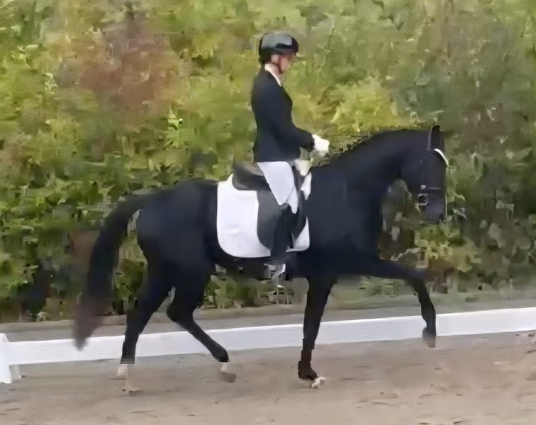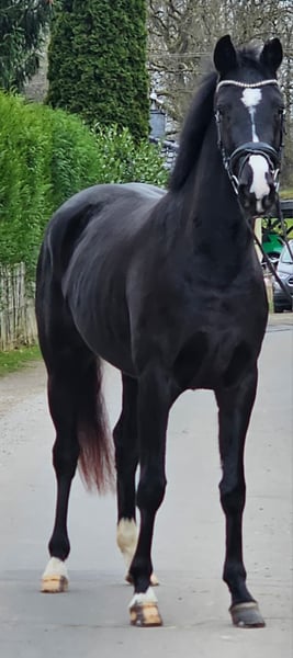 Die hübsche Bea stammt aus unserer eigenen Zucht! Bis zum Tag des Anreitens stand Bea ganzjährig drausen und konnte ihre Jugend in vollen Zügen genießen. Sie ist eine bildschöne Rappstute und bringt alles mit, was man für das große Viereck benötigt. Schon bei ihrem ersten öffentlichen Auftritt konnte sie direkt überzeugen und wurde 4. in einer Reitpferdeprüfung. Sowohl Verladen als auch der tägliche Umgang sowie putzen oder abspritzen meistert Bea problemlos. Ausgiebige Schmuseeinheiten geniest Bea auch sehr. Sie stammt aus einem hocherfolgreichen Mutterstamm. Die Mutter sowie weitere Geschwister stehen am Hof und können besichtigt werden. Bea verfügt über drei sehr gute GGA, angeritten, Röntgenbilder liegen vor, inkl Rücken und Hals, laut Tierarzt o.b.B. Sie hat einen kleinsten Chip, der laut Tierarzt keine Probleme machen sollte aber leicht zu entfernen wäre.