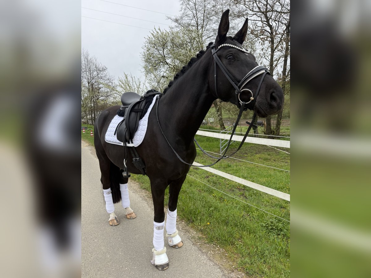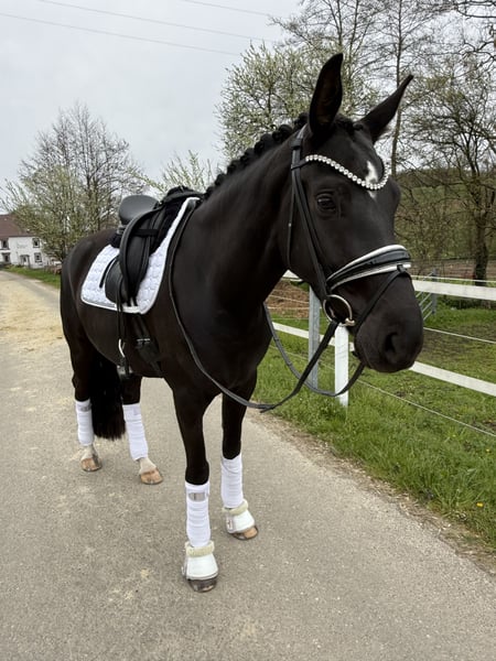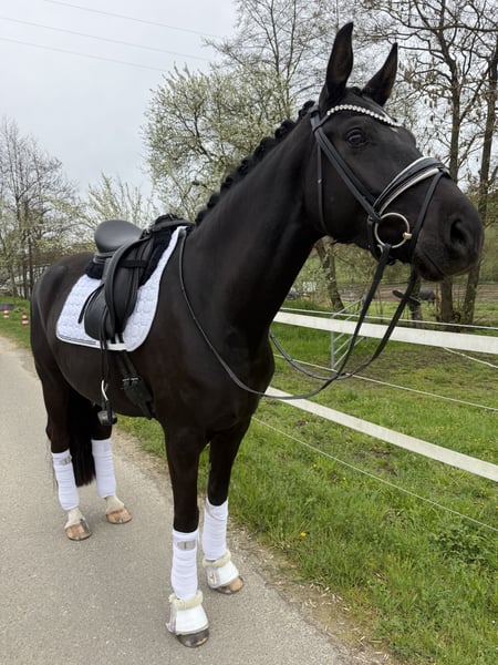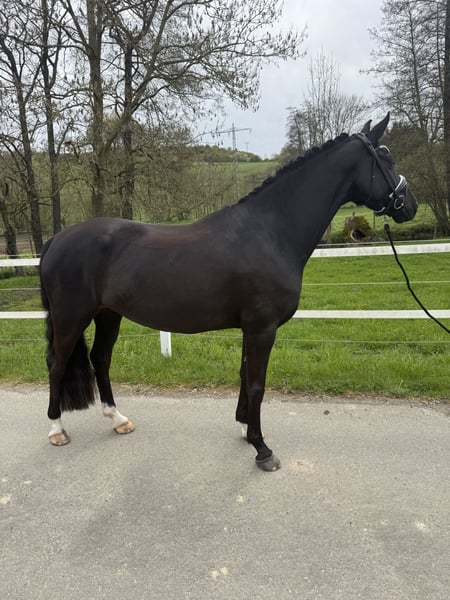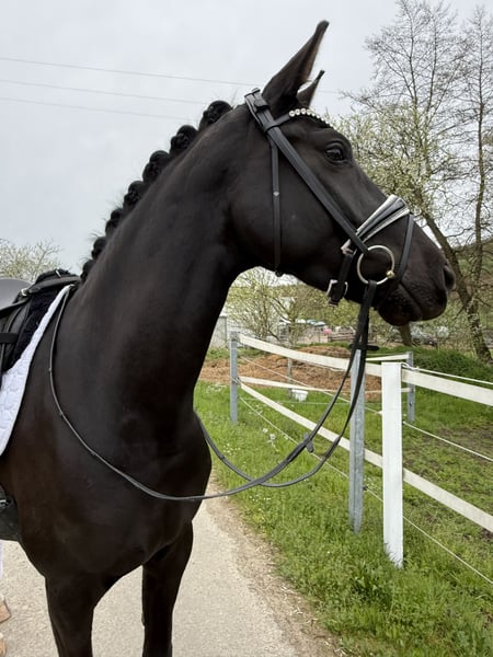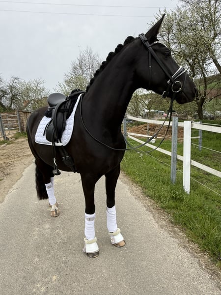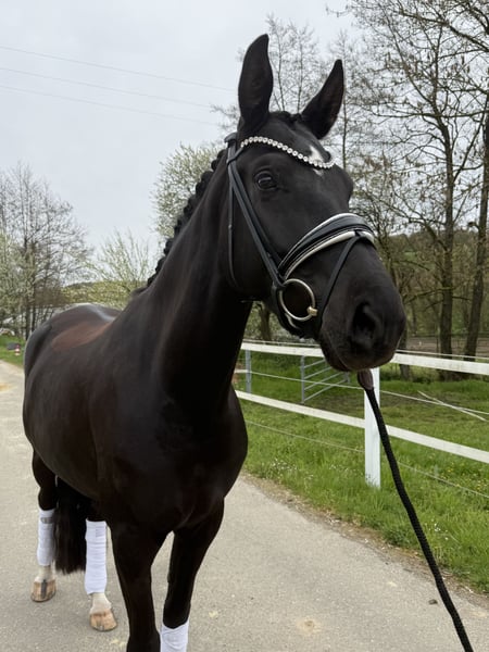 Wenn man sie malen wollte, ging es nicht schöner Zum Verkauf steht eine 4 jährige bildschöne Rappstute, die bereits für ihr Alter einen wahnsinns Job macht, also nicht vom Alter abschrecken lassen ;) *1.65m *Fürstenlook x Donnerhall *leichtfüßig mit viel Ausdruck *sehr rittig und selbsttragend *butterweich in der Hand *von „Amateurin" ausgebildet *könnte als Ponyumsteigerpferd sehr gut geeignet sein *klare Perspektive für die schwere Klasse *absolut kopfklar, nichts über die Uhr gerittenes Hier reift ein wirklich qualitativ gutes und besonders schönes Dressurpferd heran, das alles mit bringt was das Herz begehrt. Sehr viel Schwung! im Trab, immer reel durch den Körper, guter taktklarer Schritt und eine tolle bergauf angelegte Galoppade. Rittigkeit 10/10 ganz fein in der Anlehnung und angenehm am Bein. Drauf setzen, los Reiten, gut aussehen, genießen und Spaß haben. Über den Winter körperlich und geistig „weit“ gereift, so kann sie nun schon den Aussengalopp auf beiden Händen durch die Ecken tragen. Wir nennen sie immer liebevoll „Frau Einstein“ sie ist unglaublich schlau und will immer alles richtig machen, eine Freude jeden Tag zu reiten und auszubilden, leichter kann man es nicht haben. Absoluter Schatz im Umgang, sie will am liebsten den ganzen Tag gekrault und gekuschelt werden, sehr menschenbezogen, ruft wenn man kommt. Brav und kopfklar, nichts über die Uhr gerittenes. Bisher zeigte sie keine Unarten wie Steigen, bocken, durchgehen oder ähnliches. Jungpferdeerfahrung sollte bei 4 Jahren natürlich gegeben sein. Sie hat schon Geländeerfahrung und kennt Training in fremder Umgebung. Sehr gute !!! Röntgenbilder liegen bereits vor. Ein Video versende ich sehr gerne nach einer telefonischen Kontaktaufnahme 0173-2466817 auch per WhatsApp möglich. Gerne in fördernde Hände mit Familienanschluss Sie steht in 66440 Zweibrücken und kann dort ausprobiert werden.