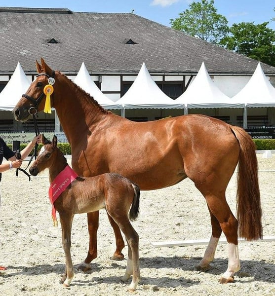 jolie jument de 5 ans, prometteuse, facile à monter – un véritable bijou pour toutes les disciplines équestres ! Elle vient directement de l’éleveur, une jument très bien dressée et facile à gérer. Elle est très docile au quotidien, que ce soit pour la ferrure, la visite vétérinaire ou le chargement. Elle souhaite toujours faire au mieux. Elle se concentre principalement sur le saut d’obstacles, grâce à son pedigree exceptionnel. En foal, elle a été remarquée lors de la foal show et a été distinguée comme meilleure pouliche. Cette jument de 5 ans, mesurant environ 1,67 m, réunit toutes les qualités que l’on attend d’un cheval de sport moderne : mouvements expressifs, un saut puissant et intelligent, ainsi qu’une remarquable tranquillité en terrain varié. Que ce soit en dressage, saut d’obstacles ou concours complet, elle possède le talent, l’attitude et ce petit quelque chose qui fait la différence chez les grands chevaux. Elle travaille avec beaucoup de plaisir, est courageuse, claire d’esprit et apprend rapidement. En 2025, elle a déjà été classée en épreuve A de saut d’obstacles. Elle évolue avec assurance et grande facilité dans le parcours. Lors de sa première compétition cette année, elle a réalisé un sans-faute et a été immédiatement placée. Elle est également idéale pour les jeunes cavaliers ou les cavaliers en reconversion. En manège, elle se montre amicale et facile à gérer – une partenaire d’avenir avec du potentiel. Cheval de sport Westphalien, bai, taille environ 1,67 m Origines : Don Tryon – Don Diarado – Conthargos, Lordanos, ainsi que Graf Top – Acorus – Accord II