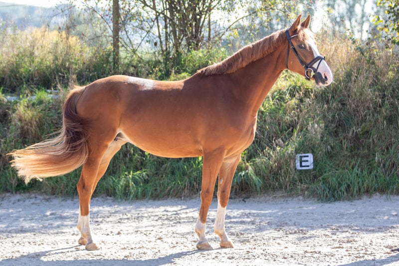 6-year-old, ambidextrous, stunning chestnut mare with great basic gaits and striking markings For sale is our stunning Westphalian mare Grace d'Amour S, Galant de Semilly x Bugatti, from our own breeding. I am a master of equine management specializing in classical riding and compete up to the advanced classes. At our family-run facility, we have been breeding successful sport and leisure horses with much love and experience for decades. One of my passions is breaking in and presenting our young horses at competitions. Grace is an exceptionally beautiful chestnut mare with a very pleasing height of 164 cm. This makes her suitable not only for adults but also for larger children. Grace has no vices, fears, or quirks. She does not buck or rear. On the contrary, for her age, she can be described as calm and strong-minded. She always wants to please, whether under saddle or in handling. Grace possesses three good basic gaits and shows herself to be eager and willing to learn under saddle. In the 1.5 years she has been under my saddle, I have established absolutely correct basics in dressage and jumping. Easy to handle, she could immediately start in the E and A classes, even with a young or less experienced rider. She was able to prove her abilities at her first competition, where she not only shone with her stylish appearance but also impressed the judges with her skills. She placed immediately in her first suitability test. On the competition and warm-up grounds, she behaves exemplary, just as she does at home, presenting herself confidently and fearlessly. In perfect health (has never been sick), brave and willing to learn, all paths are open to her. I wish for her an ambitious rider who will further educate her and present her at competitions. Her ambidextrous nature also makes her interesting for eventing. Of course, she would also make a great companion in leisure activities. You can cuddle with her and spend a lot of time together. She truly gallops into everyone’s hearts. With her nice character and balanced nature, I could also imagine a mother-child combination, where they could further promote her and perhaps present her at competitions, or simply invest a lot of time and love in her, go for rides, and have fun. Healthy and expressive with very good jumping ability, her foundation is laid, and one can decide which further path to take with her. We are so convinced of her abilities, conformation, and appearance that we even bred a foal with her last year. With her good pedigree, she is also perfectly suited for breeding. Grace is a beautiful horse with an honest character and a heart of gold. Feel free to get to know Grace and our facility personally and contact me by phone or email. A trial ride is, of course, possible by arrangement and with serious interest. To prevent riding tourism, we charge 50 euros for the trial ride.
