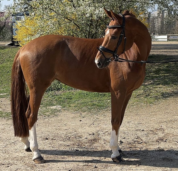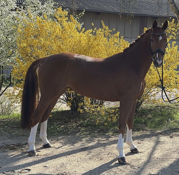 Elegant Westphalian mare, born in 2020, with an attractive chestnut coat, impresses with her graceful appearance and balanced temperament. Standing at 16.1 hh, she offers the perfect size for ambitious dressage riders who value quality and willingness to perform. This well-ridden and talented mare already shows promising potential in dressage and has a solid basic training. She is friendly in handling, eager to learn, and possesses a pleasant character, making her suitable for both competition advancement and leisure riding. Her elegant presence, combined with her good fundamental qualities, makes her a promising partner for dedicated riders seeking a reliable dressage partner. A horse that deserves attentive development and holds great potential for the future.