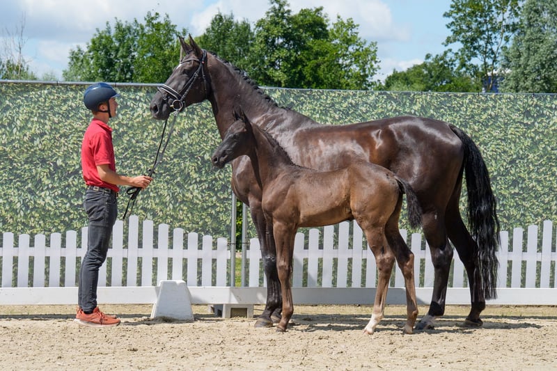 For sale is our 6-year-old black mare by Hotline. She is expecting a foal by Lord Charmeur (50-day test score of 9.0) at the end of April. Heidi stands approximately 1.72 meters (16.1 hh), is fully vaccinated (including herpes), regularly dewormed, and has been presented to the blacksmith. She has foaled twice before (both foals are black), with uncomplicated births, and she readily accepts her first heat. Due to an injury she sustained as a young horse, she is not suitable as a riding horse. She can move to her new home from early November after weaning her foal. Delivery within a radius of about 150 km can be arranged upon request. Please feel free to contact us with any questions.