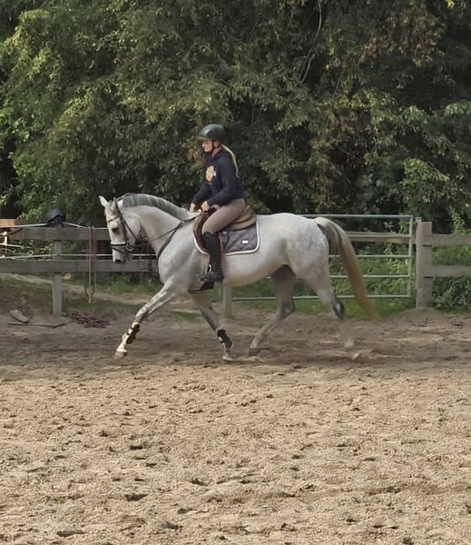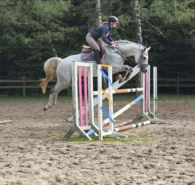 Beautiful, versatile, and exceptionally lovable dapple grey mare with good basic gaits and lots of jumping talent. Curly Sue has been ridden by a girl both on the arena and in the field and has already gained some first competition experience. She competed in an E and an A jumping class at a riding day and was placed right away. With further training, she will surely be successful in higher classes quickly. Her wonderful character makes her not only an excellent sport partner but also ensures that every day with her is fun. She is an absolute treasure both in handling and under saddle. Loading, bathing, farrier visits – all no problem. She would also be happy in a home where sport is not the top priority. What she needs most is a personal bond and engagement through her friendly nature. Curly is sensitive to aids and has a pleasant go. Her new rider should have some finesse and experience, even though she is generally easy to ride. Currently, she stays in a box at night and on a paddock during the day, but she is also familiar with full turnout. She gets along very well with other horses here. By the way, she has already had a foal and was only backed quite late, which gave her plenty of time to mature. Now she offers someone the opportunity to shape their future dream horse themselves. 7-year-old Westphalian mare, sired by Chacoon Blue, 1.64 m tall Clinical health clear Video: https://youtu.be/VtLgwymKEyQ?si=RJlm78Bji9GZzZVC https://youtu.be/_rHqji4G18Y?si=rqA1ayJ01VS3IaEq More horses can be found on my homepage MaresiLange.de Additional photos, videos, and insights into our daily horse life are available on Instagram: [maresi_lange]. Feel free to visit and get to know our four-legged friends a little better in advance. Please note: The horse’s description is based on subjective impressions and experiences and does not constitute a guarantee of properties or qualities. Trial riding is at your own risk. Sale is carried out on behalf of the owner. For viewing or trial riding, we reserve the right to charge a fee of 30 euros, which will be credited towards the purchase price if the horse is sold.