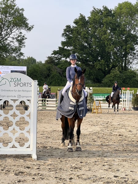 With a heavy heart, we have decided to sell our beautiful mare Giulia. She has multiple victories at A, L, and M levels and has accompanied our daughter from her first successes in A show jumping to her first M show jumping. Giulia is an absolute teacher. She forgives almost every rider error and gives her rider the necessary confidence. She is completely reliable, balanced, and a real treasure in daily handling - even at competitions, she always presents herself confidently and uncomplicatedly. She is a true ribbon guarantee and enjoys standing at the front during the awards ceremony. Despite her balanced nature, she wants to be worked and is equipped with a positive go in jumping, while remaining easy to handle and responsive to her rider at all times. We wish for our Giulia a rider who wants to learn from her and have fun, always with the certainty of having a reliable partner by their side. We will only give her into responsible and loving hands. If Giulia has piqued your interest, please feel free to contact us! Please understand that we charge a fee of €50 for a trial ride. This amount will, of course, be deducted from the purchase price.