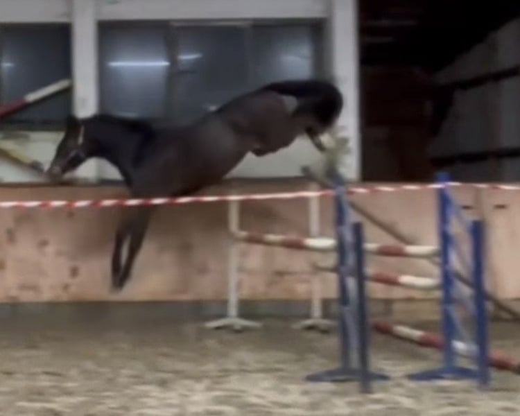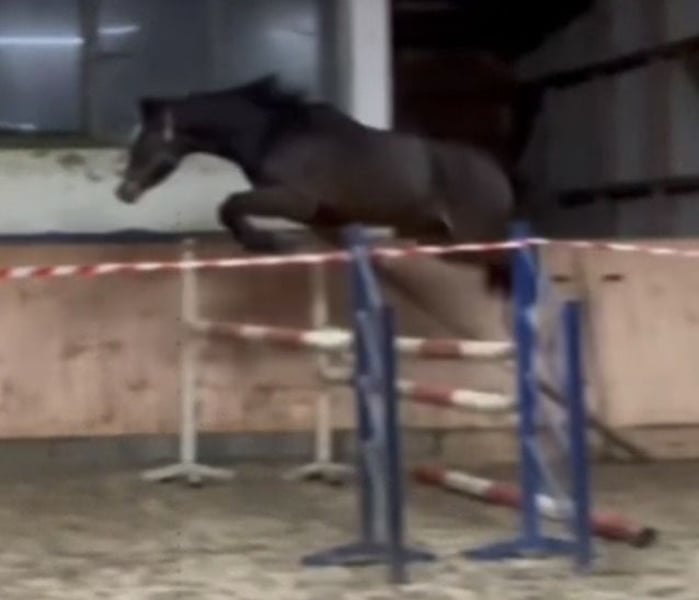Stalypso x Colcannon (Stakkato x Cornet Obolensky) Calimero is a now 4-year-old gelding, currently approximately 16.1 hh, but well-built and a real buddy type who immediately wins your heart. He has been trained with age-appropriate methods, is backed and already shows impressive potential in free jumping. His dam has placed up to M level, and his sire is well-known to everyone – excellent prerequisites for a successful sporting career. (More videos, including riding and free jumping, can be sent at any time.) In handling, Calimero is an absolute sweetheart: very gentle, well-mannered, and extremely uncomplicated. Loading, farrier, daily handling – all completely trouble-free. A young gelding that simply brings joy and always works friendly. Important! Due to a hand injury of mine, I have not been riding him for the past three weeks. Price negotiable