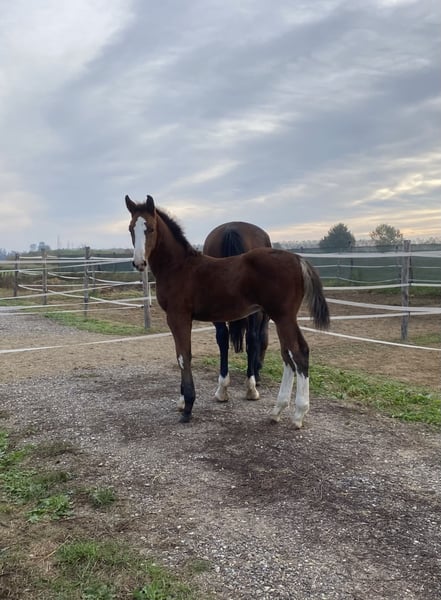 Maestro vd bischoop (Cornet Obolensky) x Carrera Vdl, la giovane madre fino ad ora ha fatto concorsi fino a 130/35 con ottimi risultati. Il padre da buoni figli con buoni risultati nello sport. Il puledro ha delle belle andature, è equilibrato e curioso, coraggioso e maneggiato dalla nascita